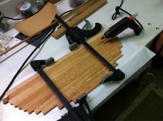 It is good to have different parts of the boat to work on as a diversion. The making of the selected bulkheads was quick and simple. Over waxed paper that protected a full scale form outline the varying strips were glued, clamped, and held with hot melt. While that sets another strip is cut and edge glued. Repeat until form outline is covered. Finally the clamps are removed and the whole is weighted on a flat surface for carpenters glue to cure.