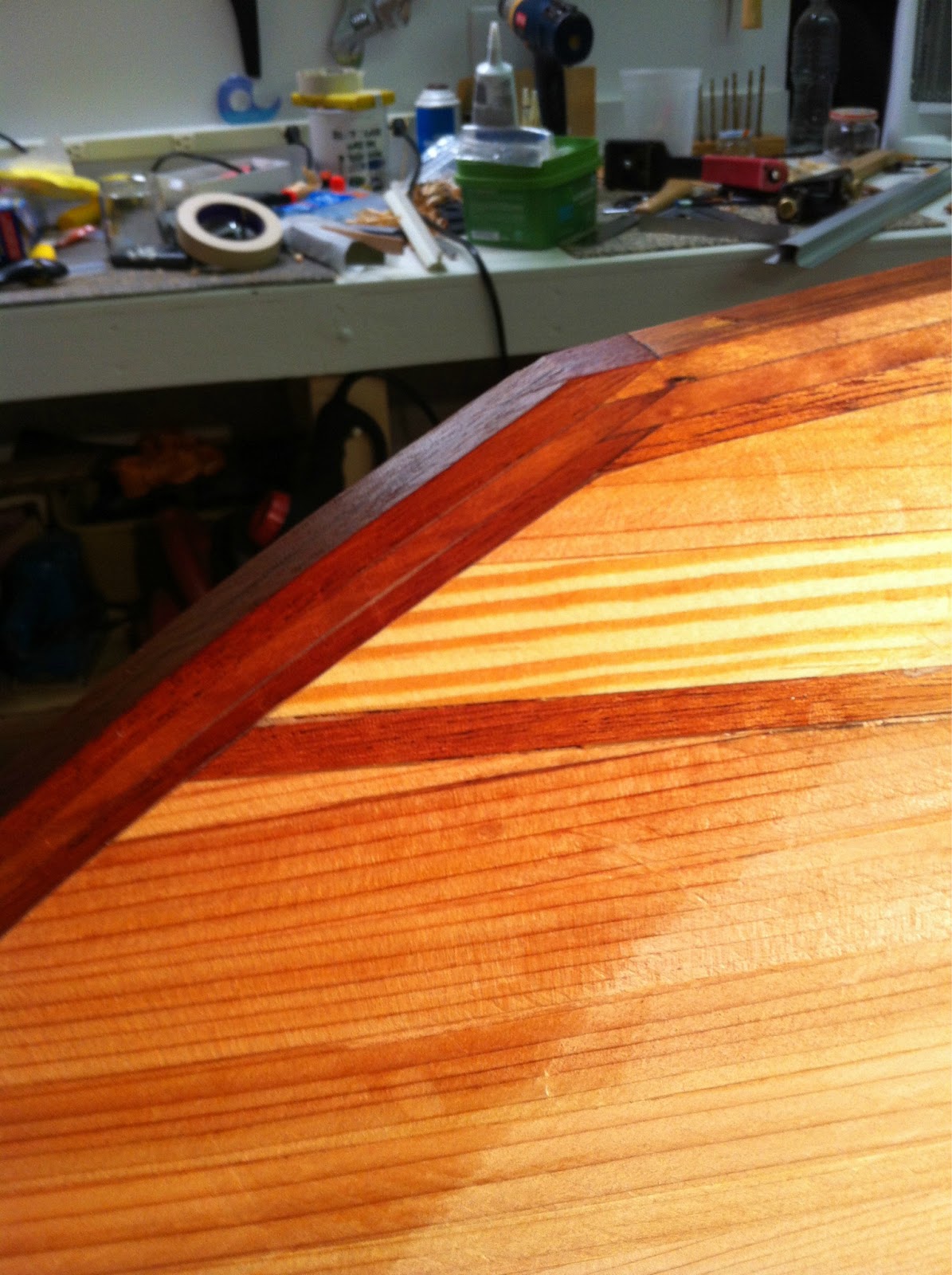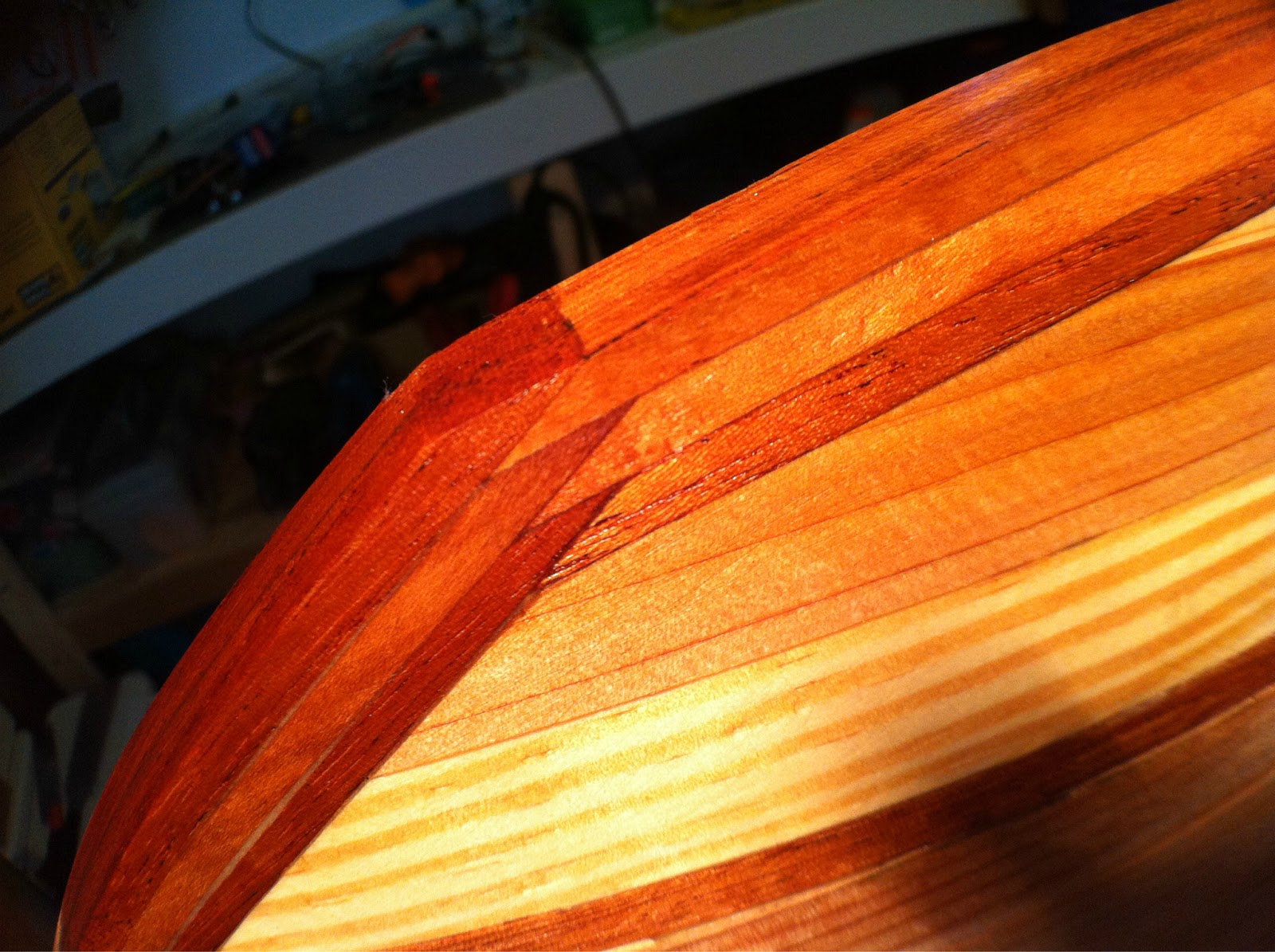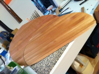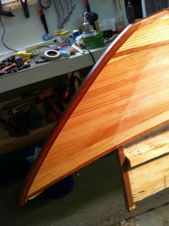 After 3 laminations on the stem, I shaped with a plane while being careful to reference a pencilled center line so as not to remove too much wood. I had to spread a little mineral spirits on the result to get an idea of the final look. Fantastic! even with the nail holes, which again, I think I’ll leave.