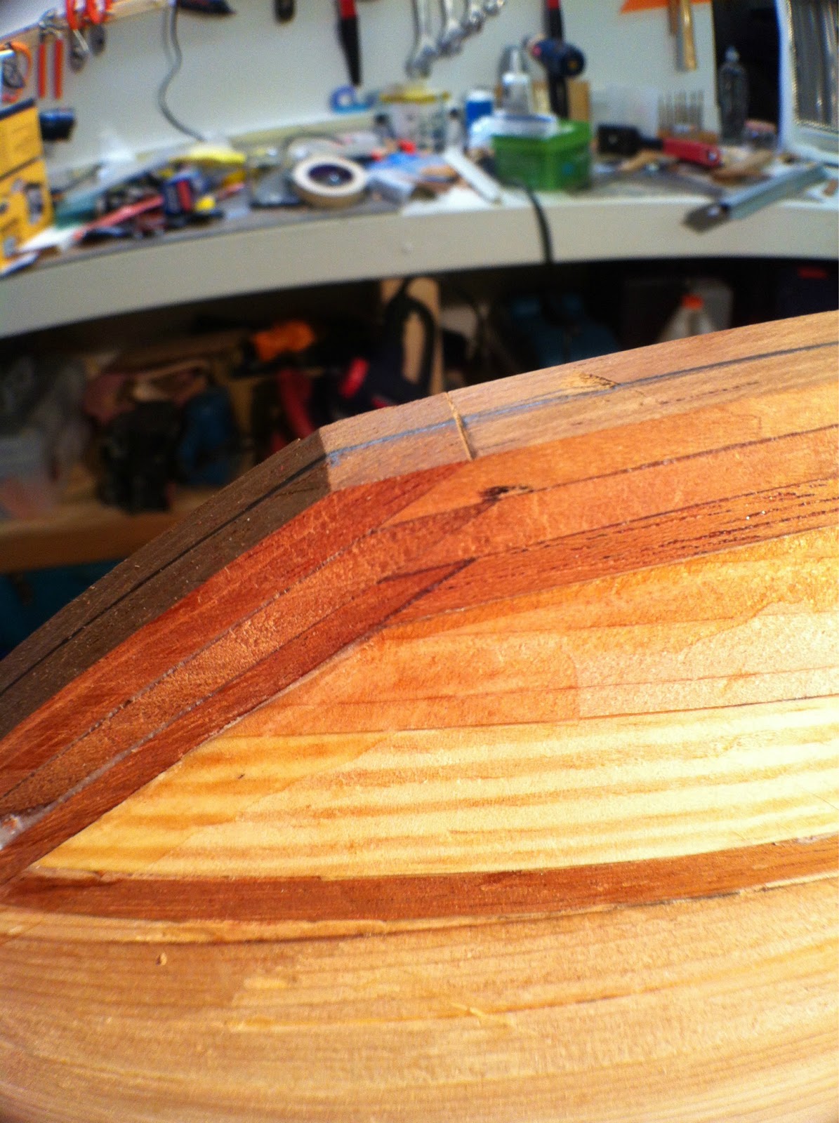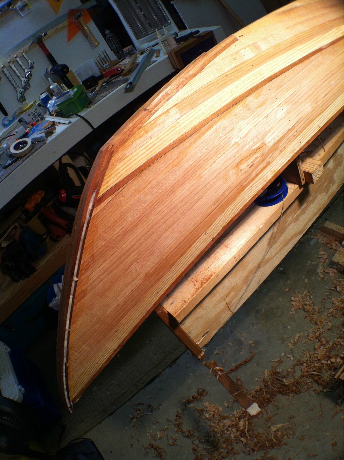 Added the 6 cheater strips to the bow. I now have the technique down. The 1st one on the stern took over 2 hrs and was poor at best. The last here took maybe 20 minutes and filled the taper quite well. The trick? Cut a strip a couple inches longer than the wedge to be filled. Make sure the grain is smooth and runs across and away from the pointy end. This eliminates the chance of cracking off part of the cheater (guess how I know. Twice!) Since the wedge is curved in reality you must take a half dozen measurements of the gap at roughly 3-4″ intervals and make them on the trim piece. Use a wood batten to connect these dots. Grab your sharp sturdy pocket knife to trim close to the line and finish with the plane. Test fit and plane some more. I left a slight bevel toward the inside of the hull. I think this allowed for some error in a spot no one is likely to ever see. Ah! one more thing: having a smooth board nearby and a chair to sit in as you address the work area makes all this more pleasant than arduous, well, at least eventually. It is all about learning.