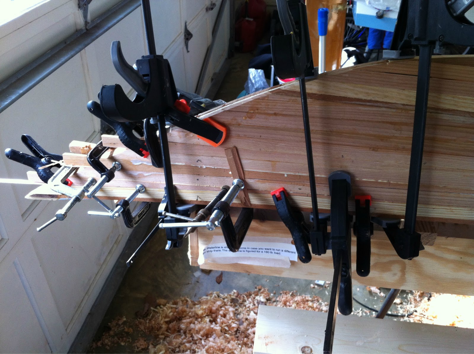 Now for the outer stems. I chiseled a “chin” off the keel to accept two 1/8″ strips of mahogany and cherry laminations. Why both woods? Because that is what was in my scrap pile in the shed. The heat gun will allow for these strips to bend along the stem easily. Once the stem is planed and sanded square to the keel, thicken some epoxy and slather it on. Masking tape helps hold the strips in position for clamping. You must get good epoxy squeeze out, but don’t clamp so hard as to make the joint dry. Make sure the clamps remain in place. I left the garage for an hour and returned to see a clamp on the ground. This resulted in the joint opening in that one location. Fortunately it is small enough to be filled with dust & epoxy later.