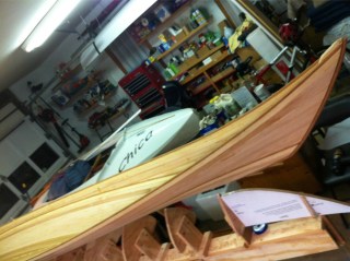 This evening I spent about an hour shaping the outer bow stem. I had hoped to have done so yesterday prior to the Superbowl, but the epoxy between the laminations was not setting. Oddly enough it wasn’t until I took this shot tonight that I realized … I HAVE A BOAT! So, with a little help I popped the hull off the forms. Nothing cracked. She weighs 18 lbs 8 oz. This is prior to any scraping of the interior or sanding at all. I expect to lose a few pounds still (from the boat that is).