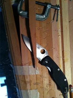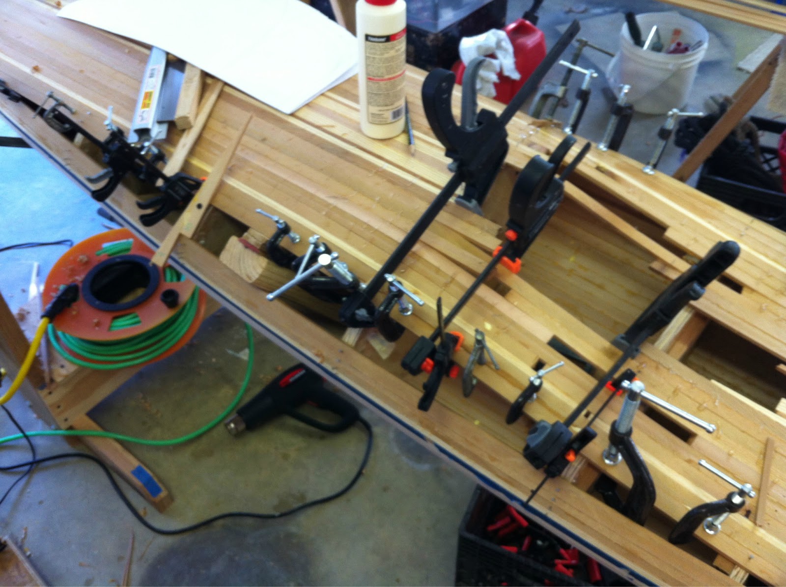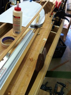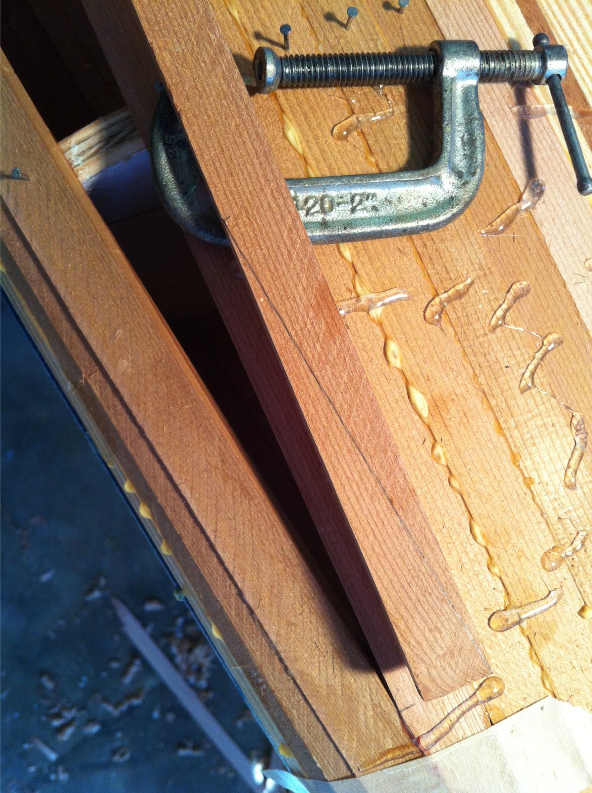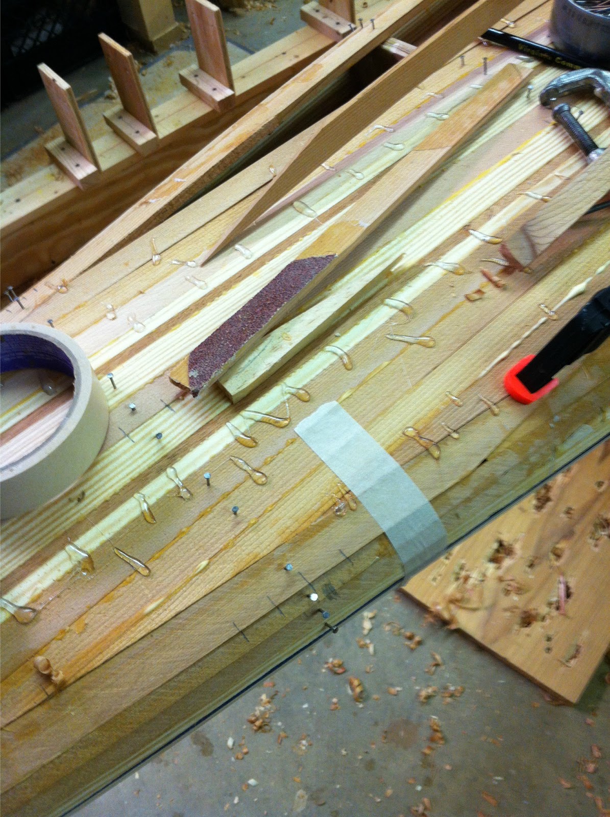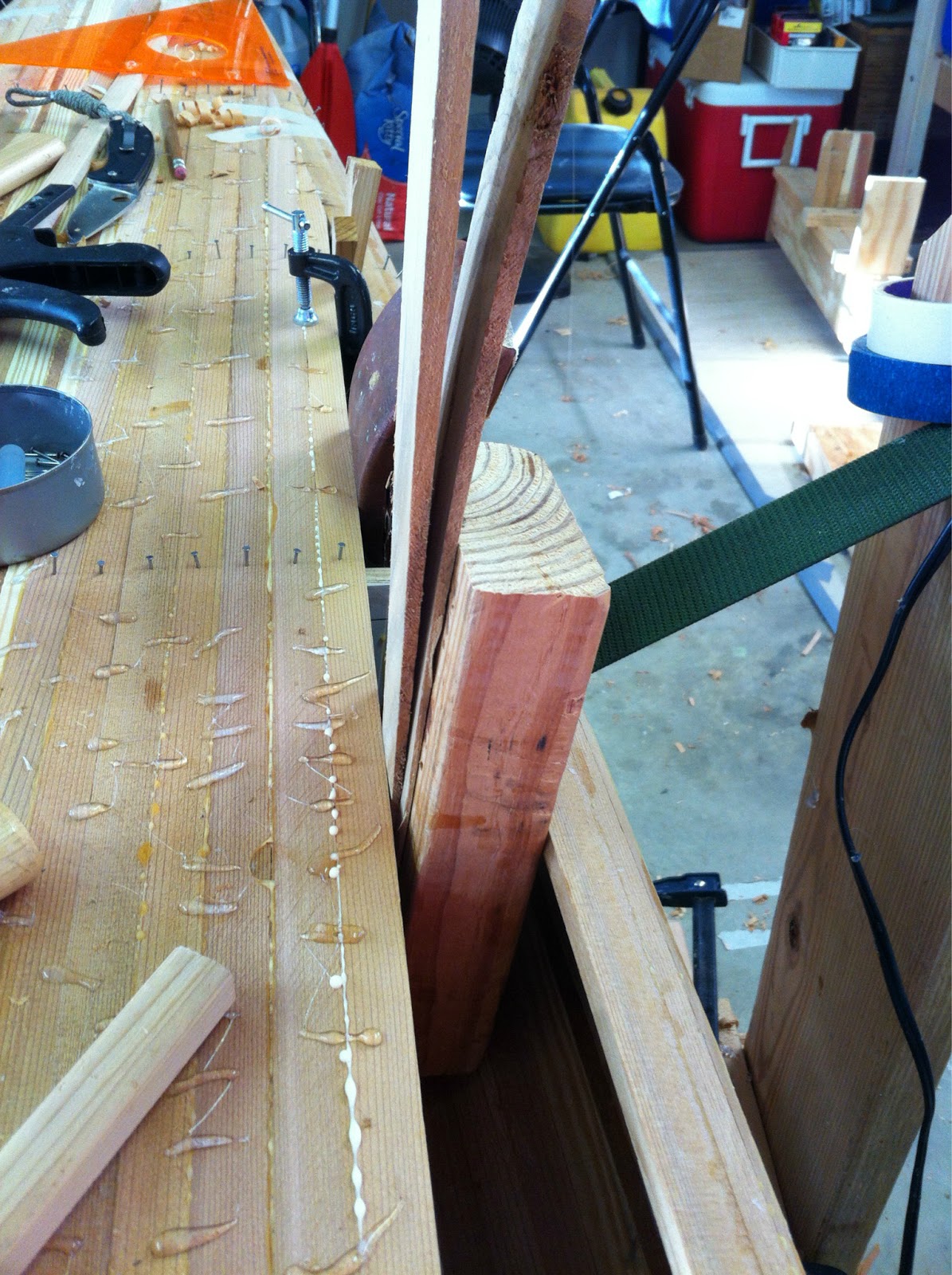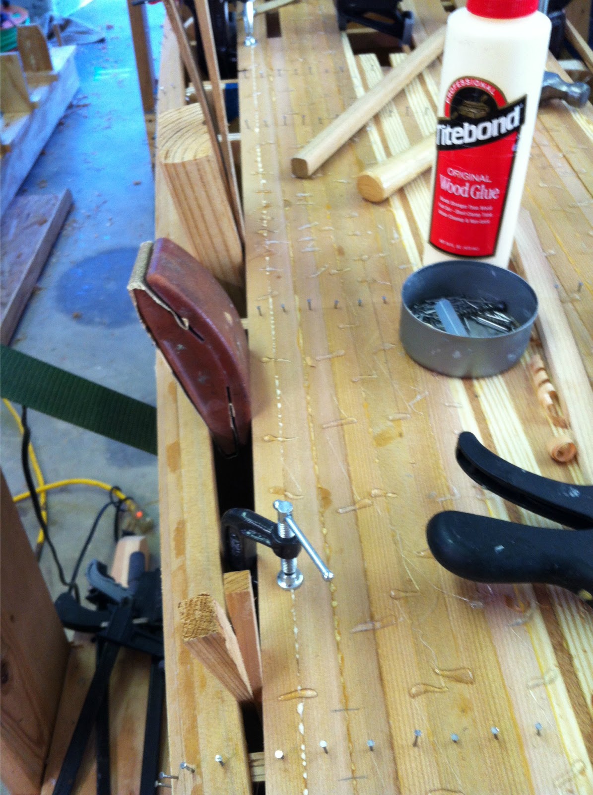 Thursday night, with the help of the “crew” that showed for dinner, we put the table saw back in the shed. It deserves better care than it has had over the past 2 months. I also thought any more cutting would be of shorter boards. As luck would have it, I ran short on strips and have been scarfing pieces together, but generally that went well.