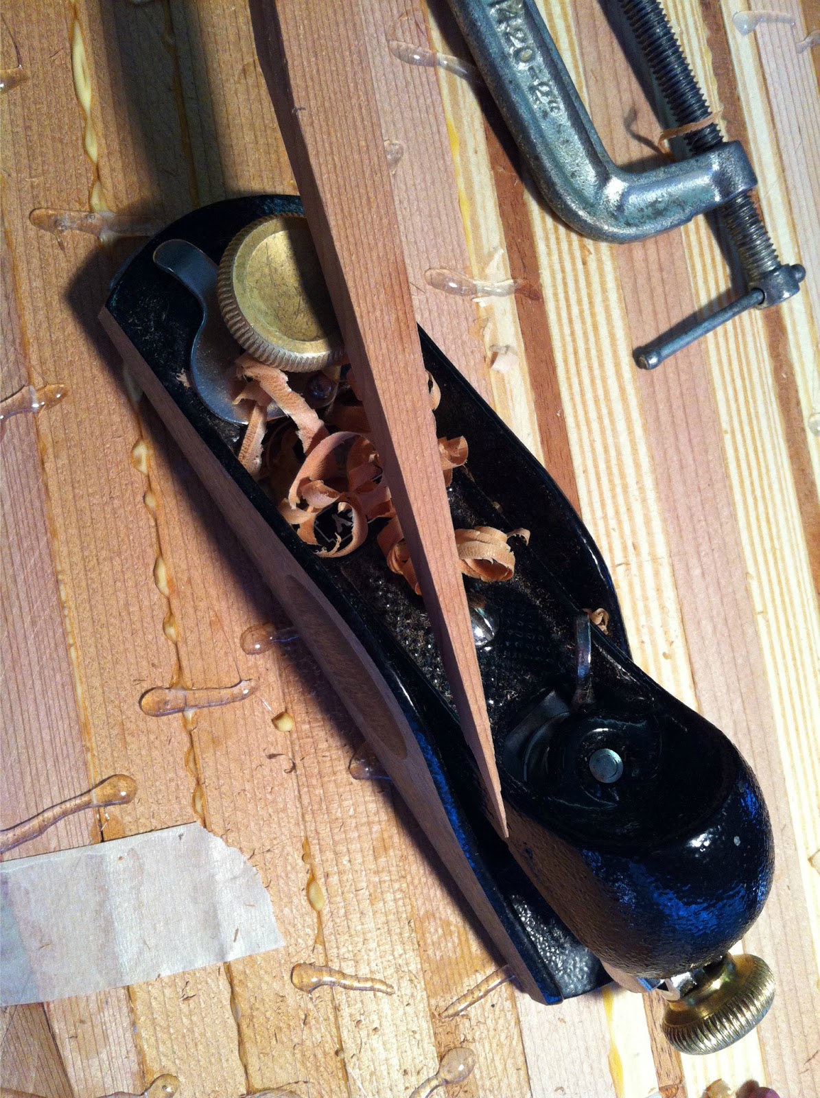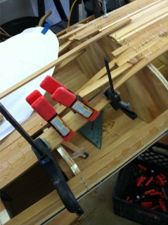 I had thought the deck would be easier than the hull. There is physically less of it. Yet, the strips are really tortured left and right of the cockpit. A tremendous amount of twist here requires using the heat gun to relax the ligaments in the wood. Additionally, there is a rolling bevel that must be shaved here to assure a nice joint. I think I’ve got it, but only later planing and sanding will tell. I’m certain the underside will show some misses. Thankfully that will be hidden.