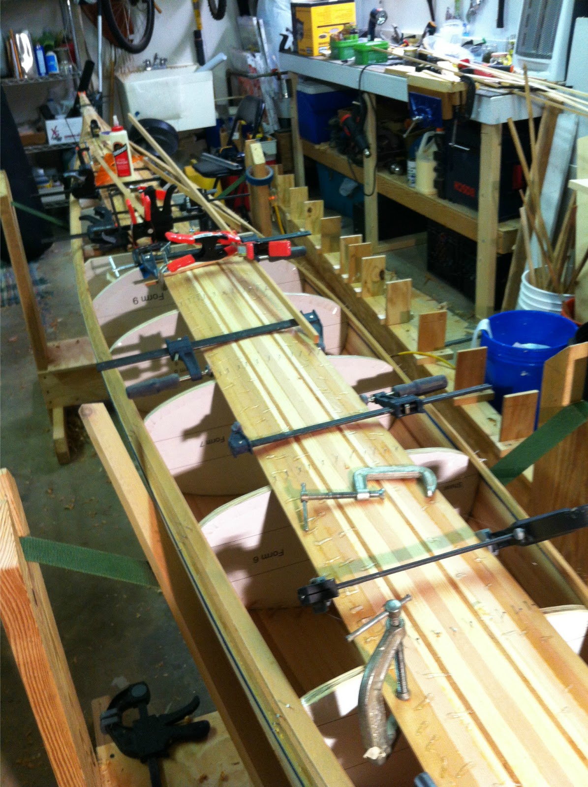 Once the deck is stripped out, I’m told you’re at the halfway point in the build. It has gone quicker than expected and has been a joy really. Yet, at some point this past week I became much more absorbed with turning another page on this kayak. Taking pics became a distraction, but I did continually stepped back to admire the lines.With the hull ready for glassing, the deck seemed an easier undertaking. In reality it is perhaps more difficult, yet my new found skills have allowed me to motor on through completing the strips. I’ve become proficient at measuring, whittling, planing, and then sometimes giving a slight sanding to the tapered ends of strips for a tight fit.