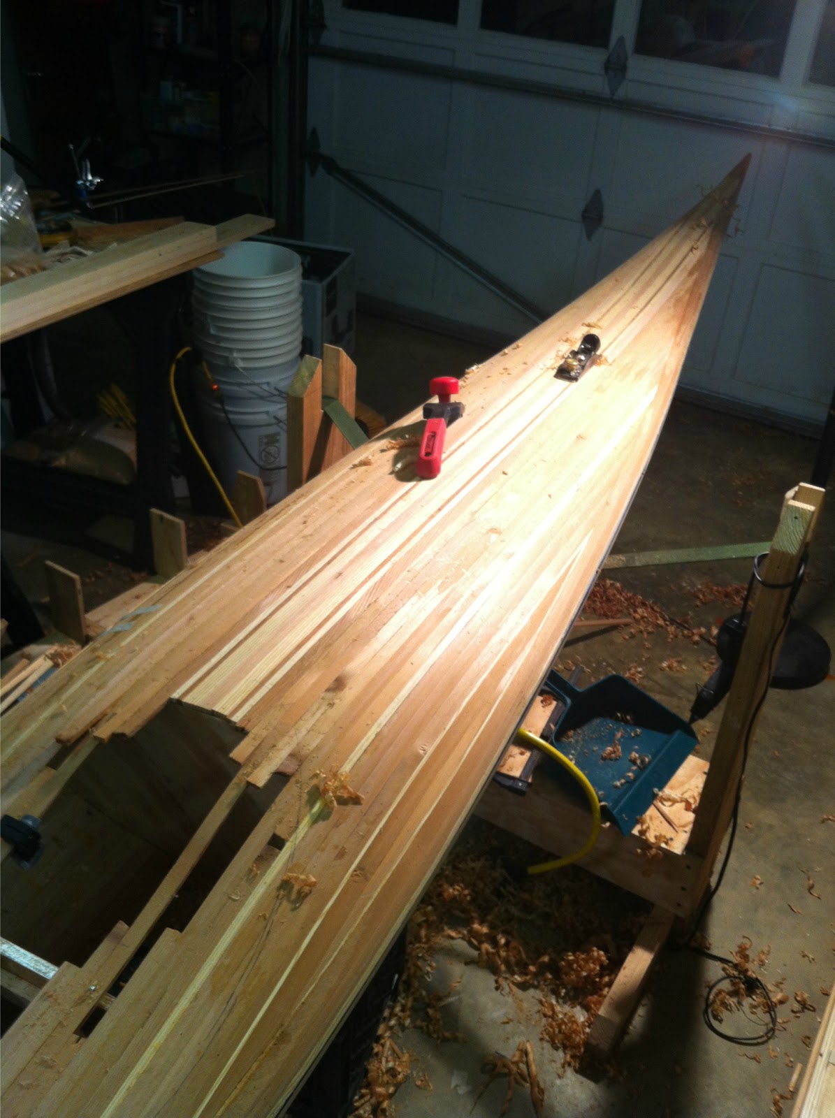 When I mentioned that I had put the last strip on the boat, my youngest boy (9yrs) piped up and asked, “What about the cannonball hole?” Well put. You can see a light pencil line of the final hole for the cockpit. I didn’t want to fair any more area than needed. Some of this I’ll cut back before glassing as projecting sticks will mess up the laying of the fabric I think.