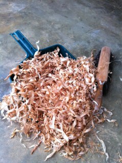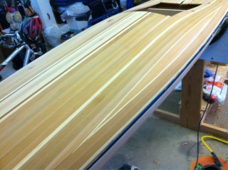I’m now sitting by the wood stove after a productive afternoon. Planed, sanded with 60 then 120 grit, and filled the nail holes with sawdust and epoxy in the deck. While the temps have not been agreeable for glassing yet, they are fine for this exercise. I had hoped to do all this outside, but rain prevented. Using a fan on the deck pointing out the garage may have helped, but there is a fine dust all over the garage (more work, clean up, later).