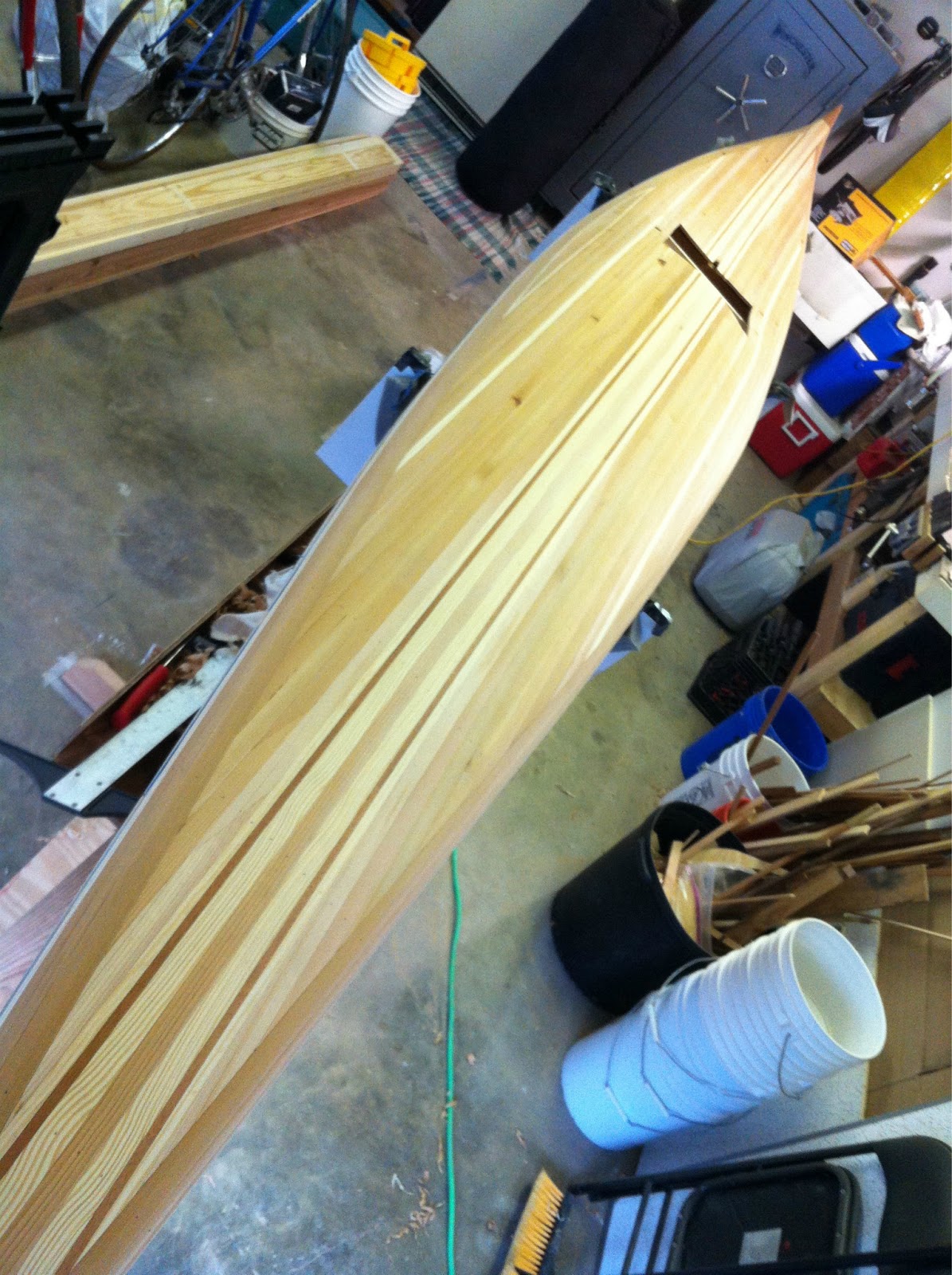 I’m now sitting by the wood stove after a productive afternoon. Planed, sanded with 60 then 120 grit, and filled the nail holes with sawdust and epoxy in the deck. While the temps have not been agreeable for glassing yet, they are fine for this exercise. I had hoped to do all this outside, but rain prevented. Using a fan on the deck pointing out the garage may have helped, but there is a fine dust all over the garage (more work, clean up, later).