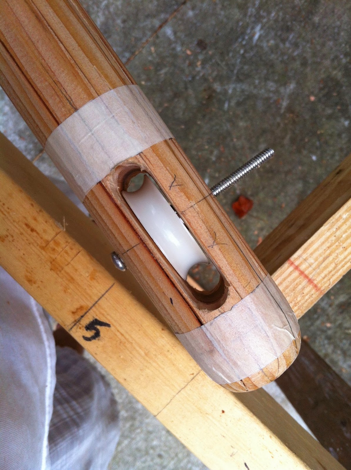 In preparation for spar sanding, I decided to cut the openings for the mast sheaves. I pulled the Delrin sheaves from a pair of old Schaefer blocks I found in the shed (don’t know what boat they came from). Both are approximately 3/16″ short of the mast tips and will work just fine for the halyards.