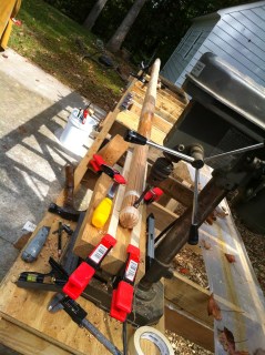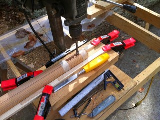 I jigged the spars level on the open bench, chocked them in place, and bore holes for the sheave slots. A Forstner bit did quick work of it.