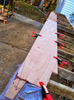 - Since I let the bow end run wild for final shaping, I was not convinced I had enough panel once joined so I added 8″ from what was to be cut off at the stern end.