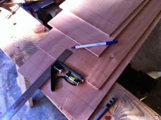 To back up, here are a couple shots of the scarfing marking, stacking, and trimming. The jack plane makes fairly quick work and the last touch of the belt sander makes it all right.
