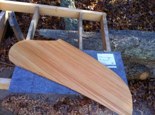 Templates for a NACA 007 foil proved a right fit for the slab thickness of 31/32″. These were paper outlines glued to 1/4″ ply, saw cut and filed to the outline. Loads of jack planing approximated the shape well enough for a controlled sanding of 80 grit in the belt sander. The result: a tapered foil that is ready for final finish sanding and glass. I’m very happy with this. What a transformation. She is now a princess.