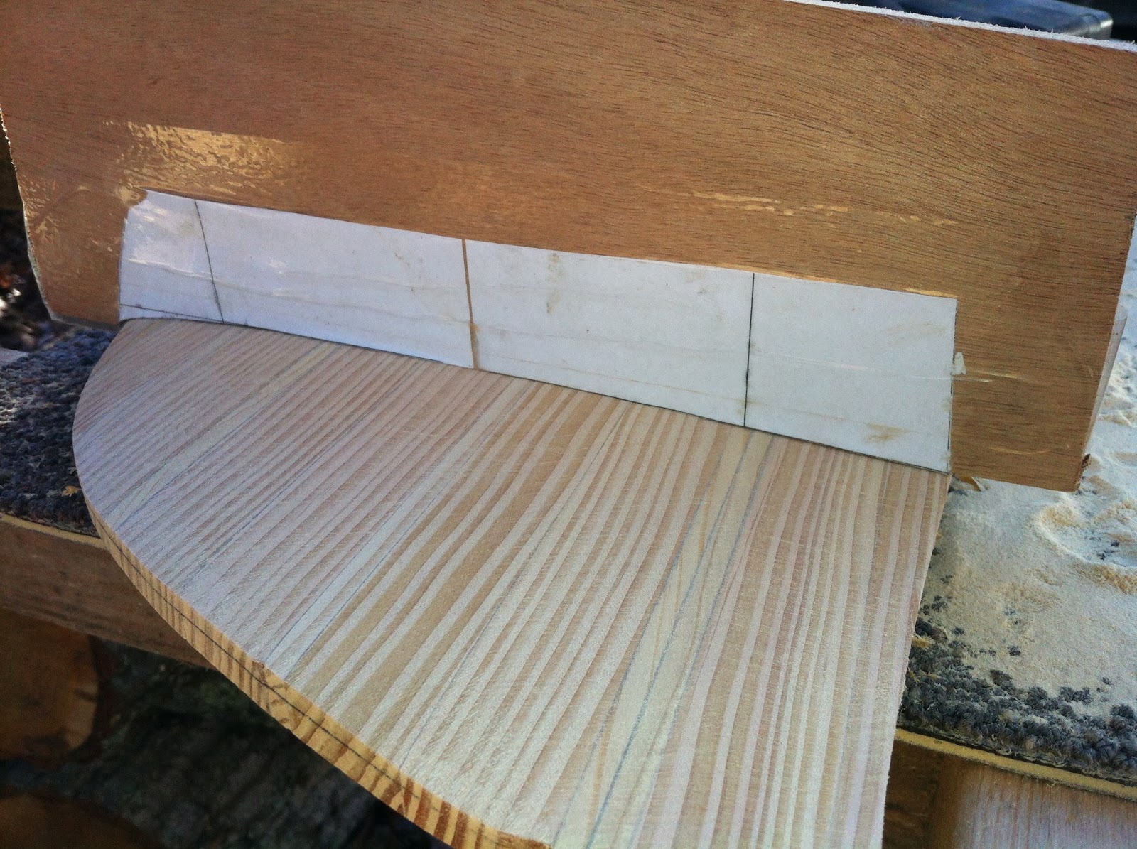As I’ve said, it is good to have other pieces of the boat to offer relief when certain tasks lose some interest. After getting some work done early this morning, I went to inspect the latest plank glue up. They were solid, but I lacked motivation to take them on. Then a look at the rudder blank proved to egg me on. I took the blank with paper template spray mounted on to the Skil bandsaw. What a piece of junk. Even a new blade couldn’t move through the 1″ stock. Just not enough horsepower. The Bosch scroll saw wins again.