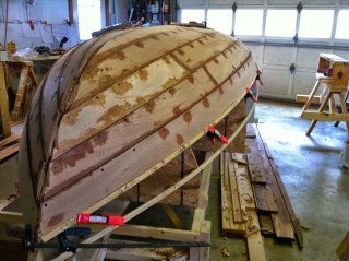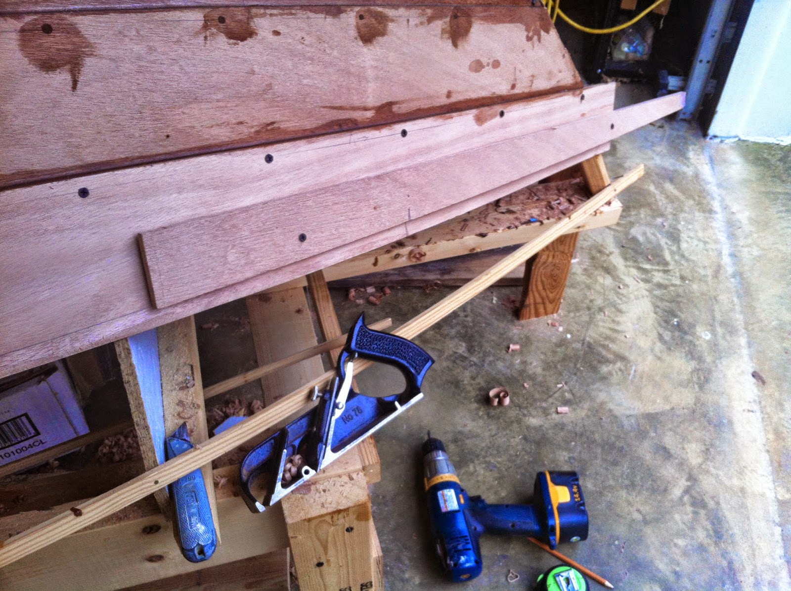 Absent, but not out … I’m close to scarfing the whiskey/shear plank. I pulled the last “truss” template last night. It is proper that this plank is last for it provides the most “show” for the boat. As the uppermost and outer edge, it has all those previous laps lifting it up. I’m frankly still not convinced that all my tweaking of the shear batten is right. A distant view isn’t possible in the now tight garage, or for that matter, out on the drive. We’ll have to wheel her out once the whiskey is down. In the meantime I’ll add 1/4″ to the shear line for safety and scribe a batten once upright and in the drive for good eyeballing.