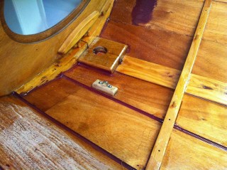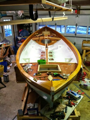 4th: I have the rig and control lines all figured out. I found myself mounting hardware after much study and then coming up with better ideas. So, I’ve a few holes to fill. Once the boat is complete (soon I hope), I’ll take more detailed photos. I expect to be done with painting the interior this week and be moving on to varnishing.