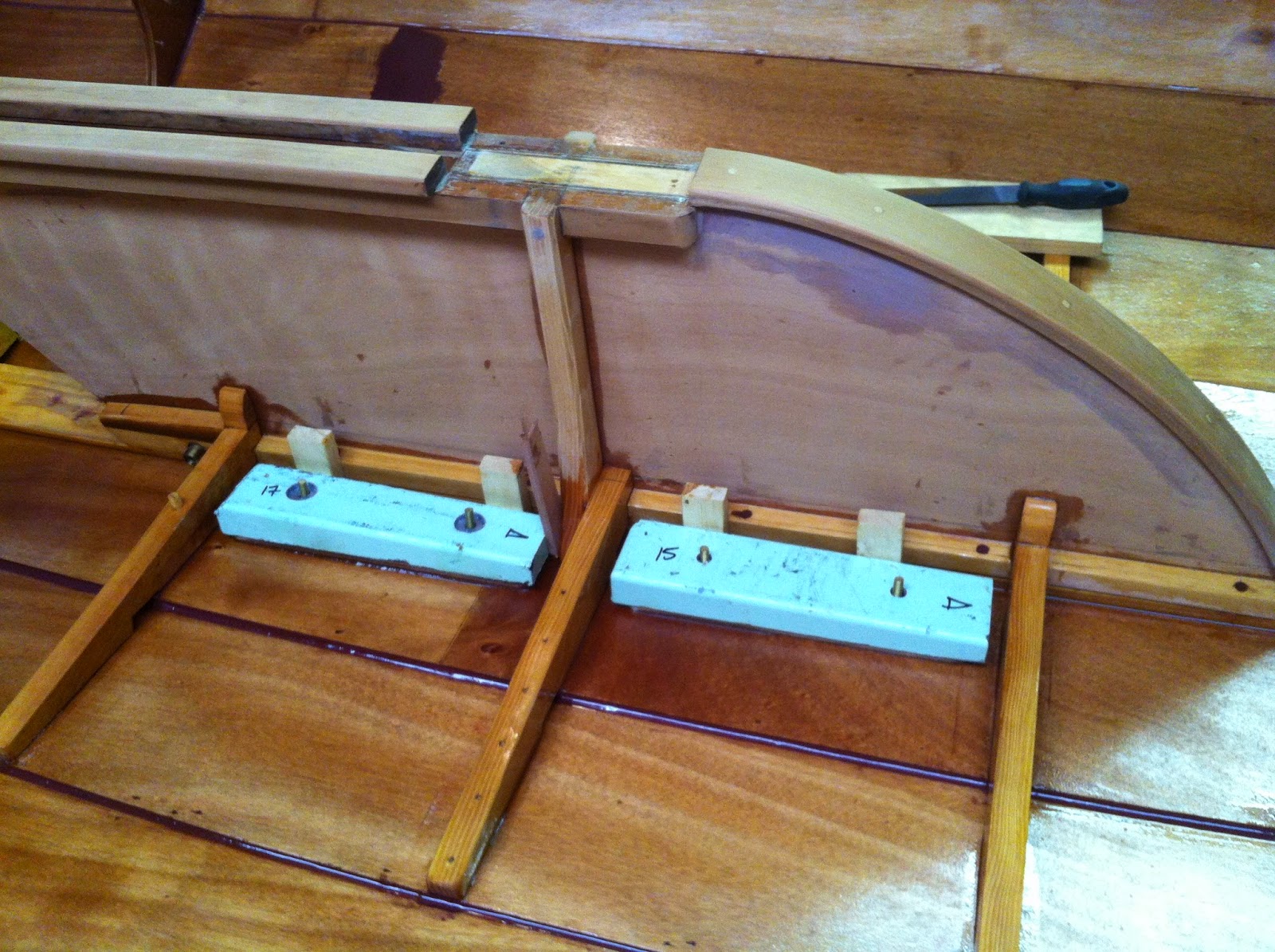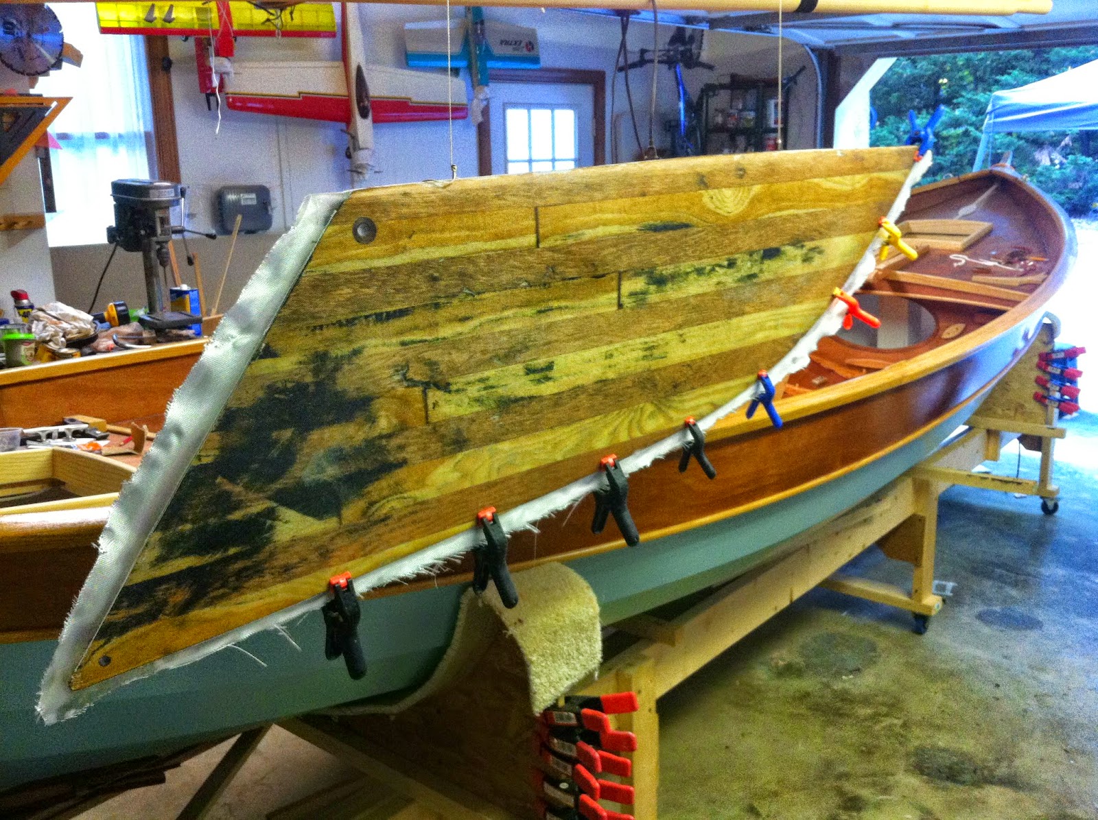 1st: After attacking the warped centerboard with the heat gun and scraper, the board seemed to relax and straightened a bit. Some judicious clamping over a board and pouring boiling water on the concave side helped further. Finally, I set an old boat battery on the board while suspended at either end overnight. This action and drying brought it all back into alignment. With some sanding and glassing on both sides simultaneously, we are back on track.