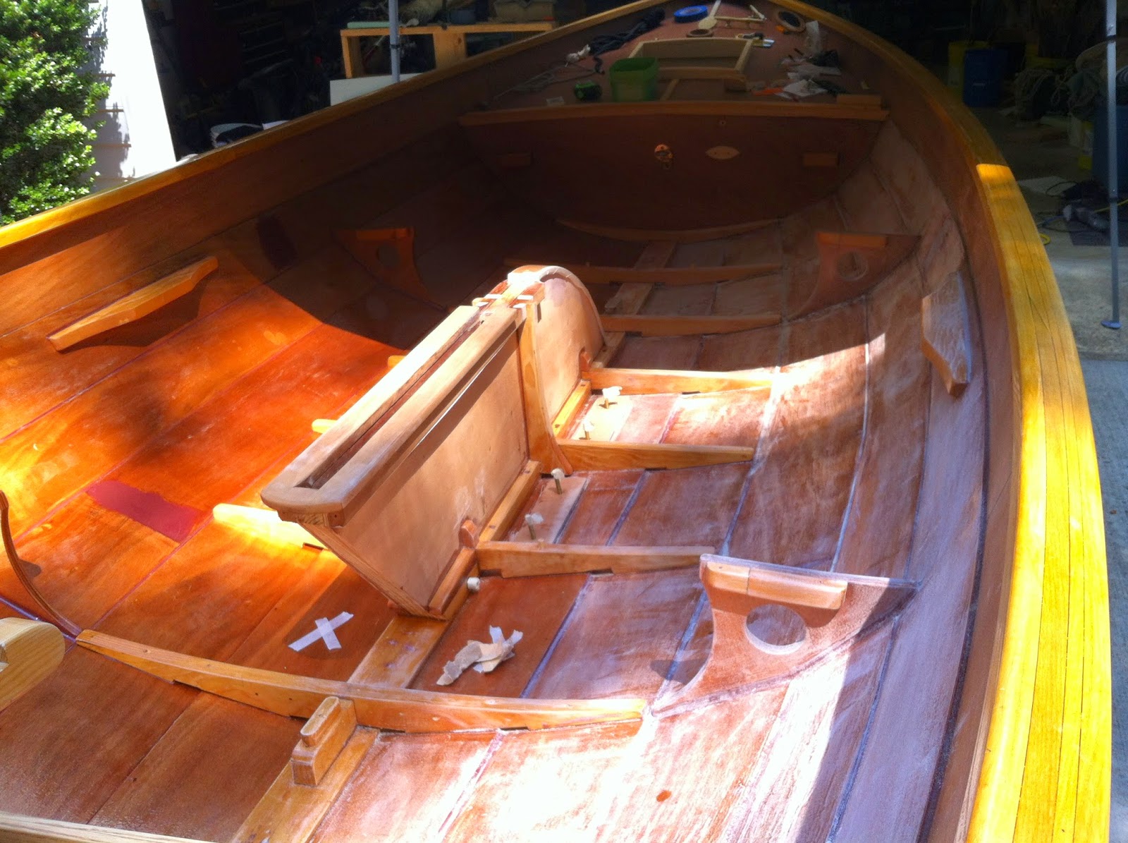 4th: I have the rig and control lines all figured out. I found myself mounting hardware after much study and then coming up with better ideas. So, I’ve a few holes to fill. Once the boat is complete (soon I hope), I’ll take more detailed photos. I expect to be done with painting the interior this week and be moving on to varnishing.