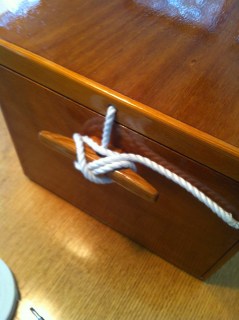 Box was shellacked for color and varnished to protect it. Rope tie-downs keep the lid on.