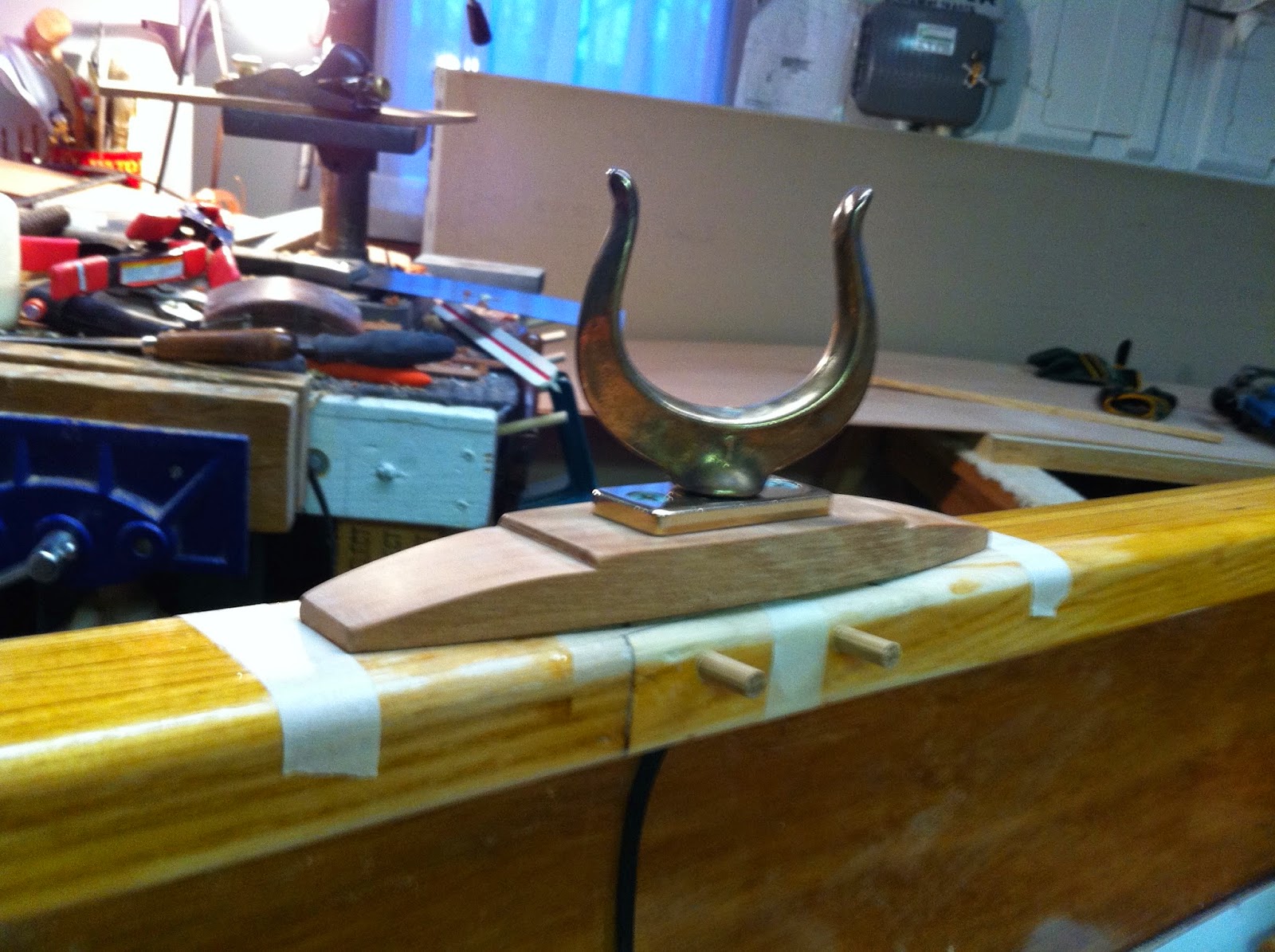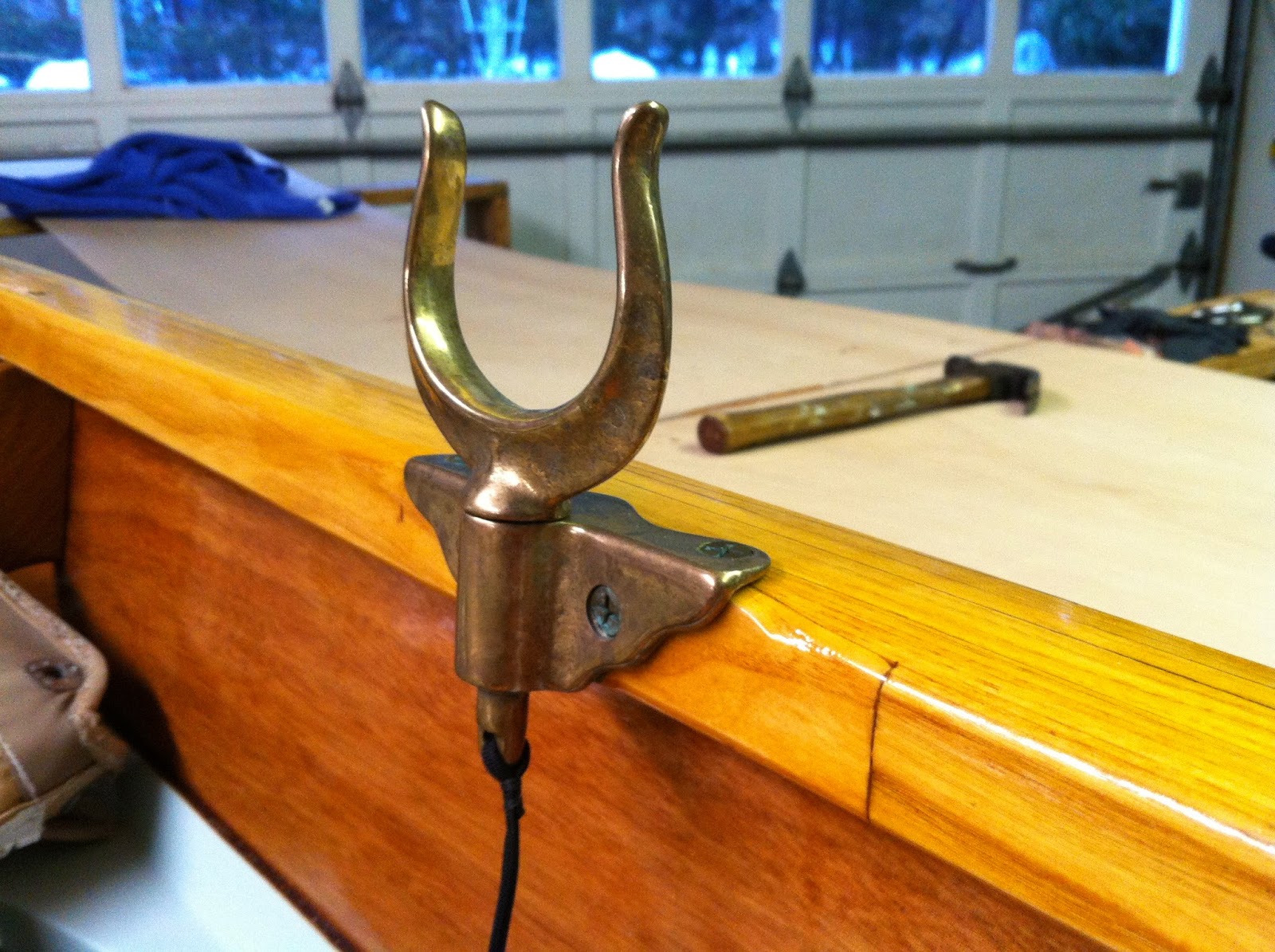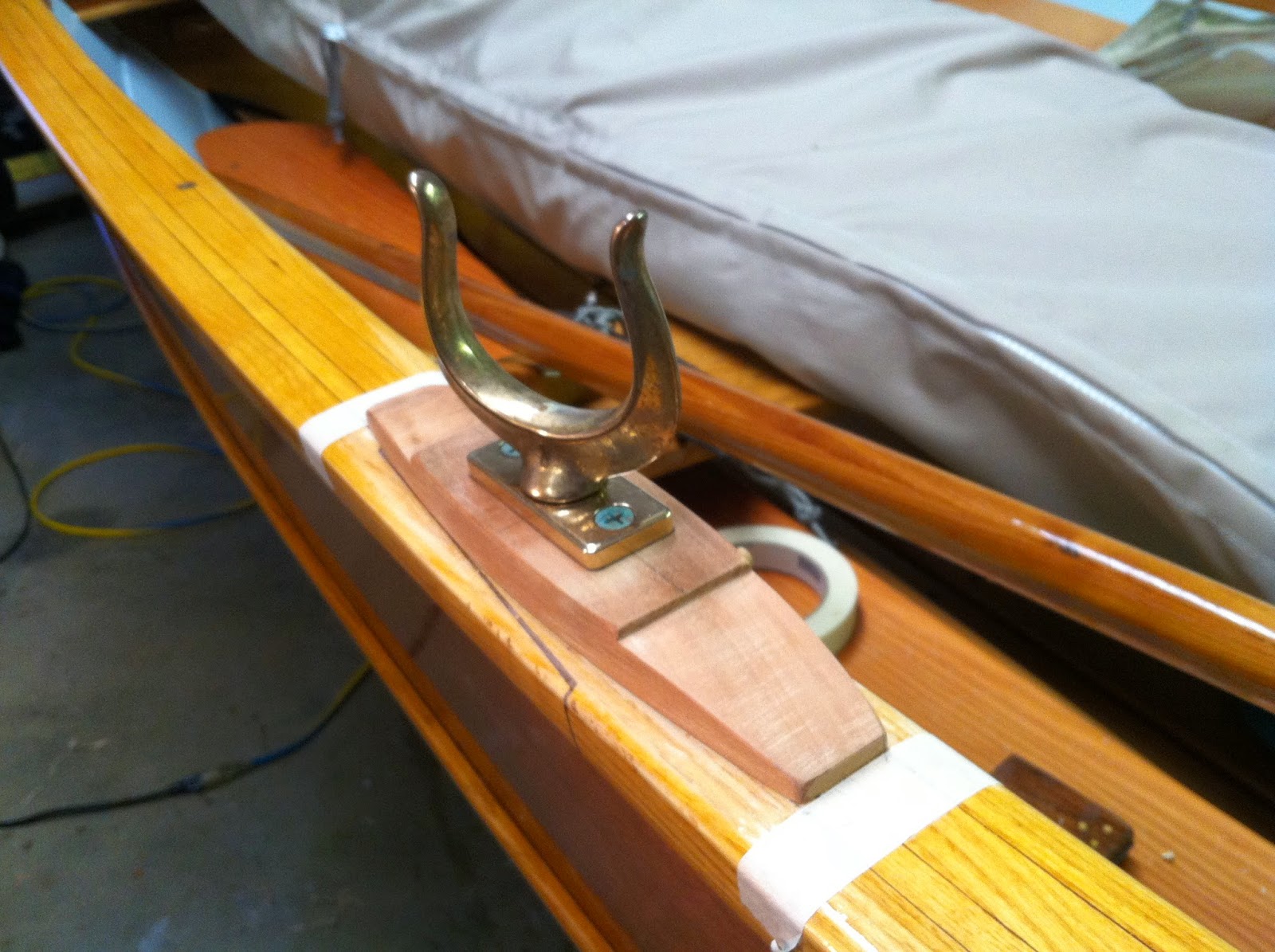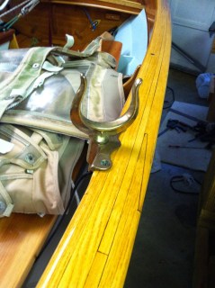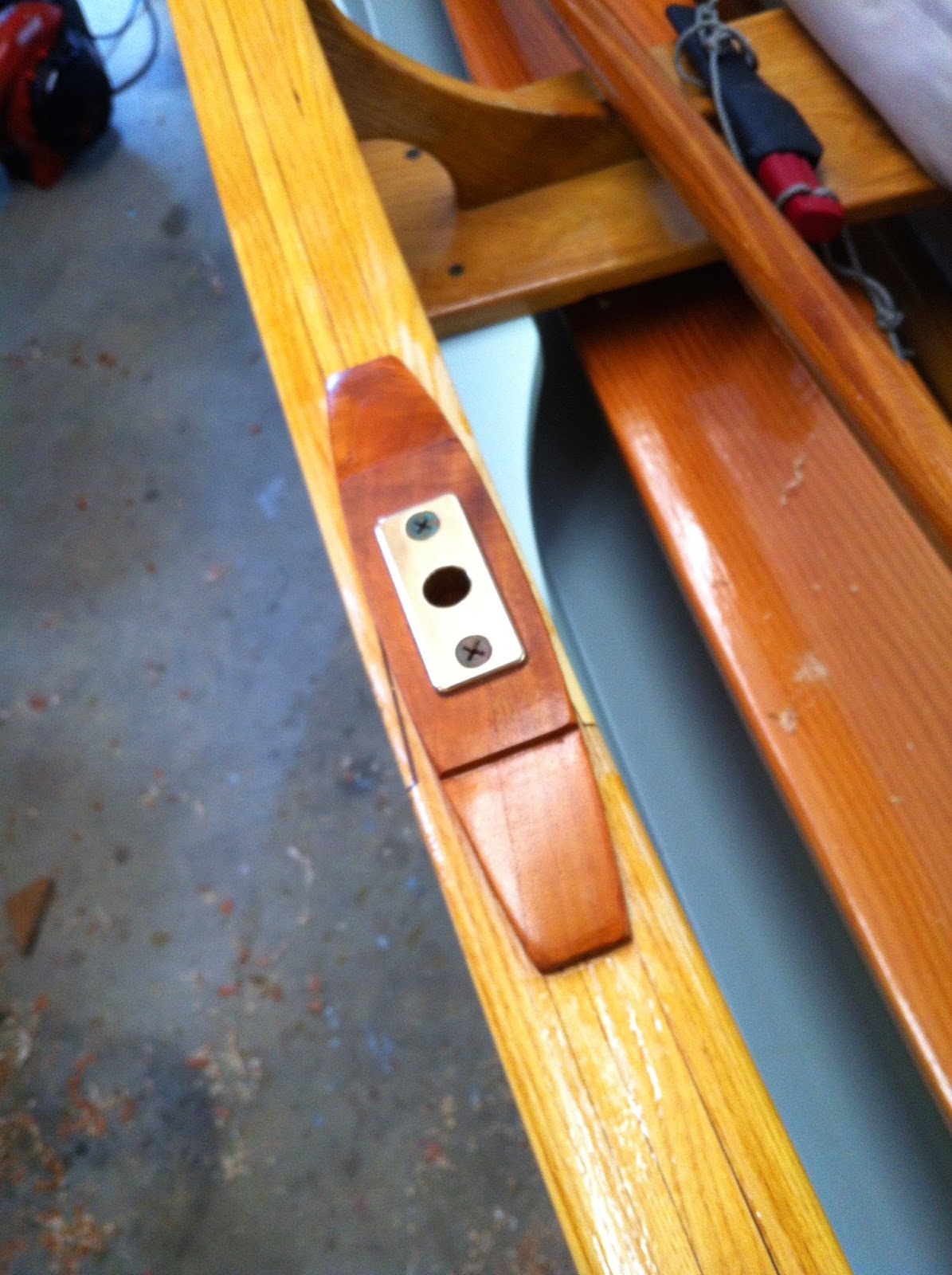 Socket pads are now epoxied onto the boat. Varnish coats will have to wait for some warmer couple of days. Epoxy was coated inside the body of the pad as well as inside the hole now in the gunnel for the socket and horn to protrude and weep any water that might otherwise collect.