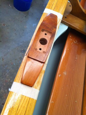 The solution was to raise the sockets 1/2-3/4″. I did not see an elegant solution with the current angled sockets, so I removed them, fared the gunwale, fashioned new pads from cherry scraps, and fitted standard sockets to them.