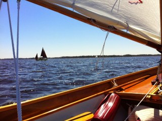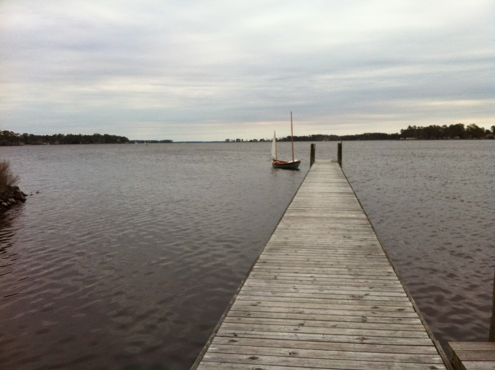 This morning’s light breeze morphed into a single then double reef romp to windward up Pamlico River before we all turned off wind to reach along and up Pungo River. The temps and evergreen shores reminded me of Maine.
