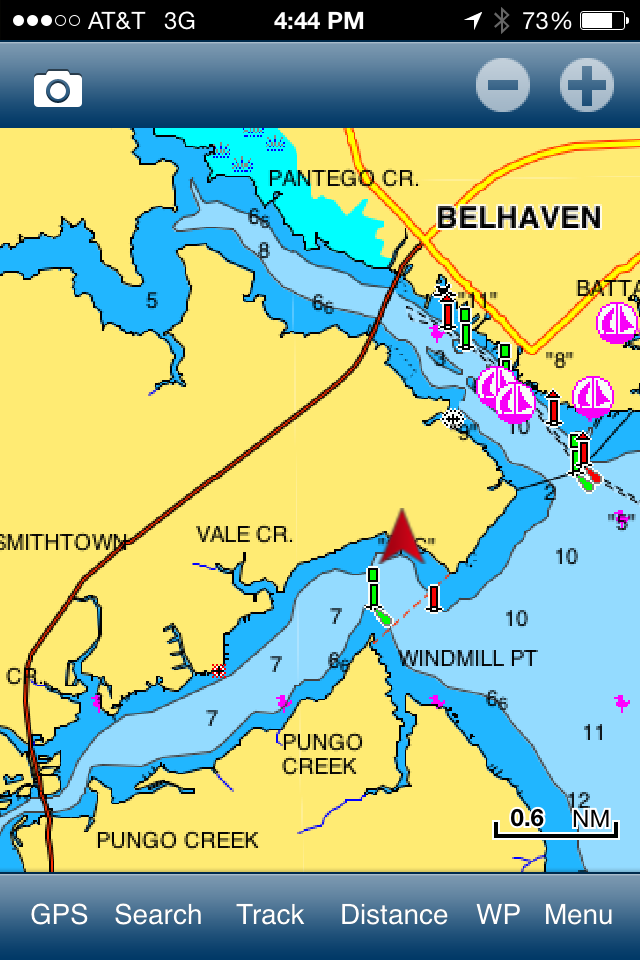 Blowing 12 kts we all took in a reef in the main just before the breakwater and sailed to weather SE up Pungo Creek.