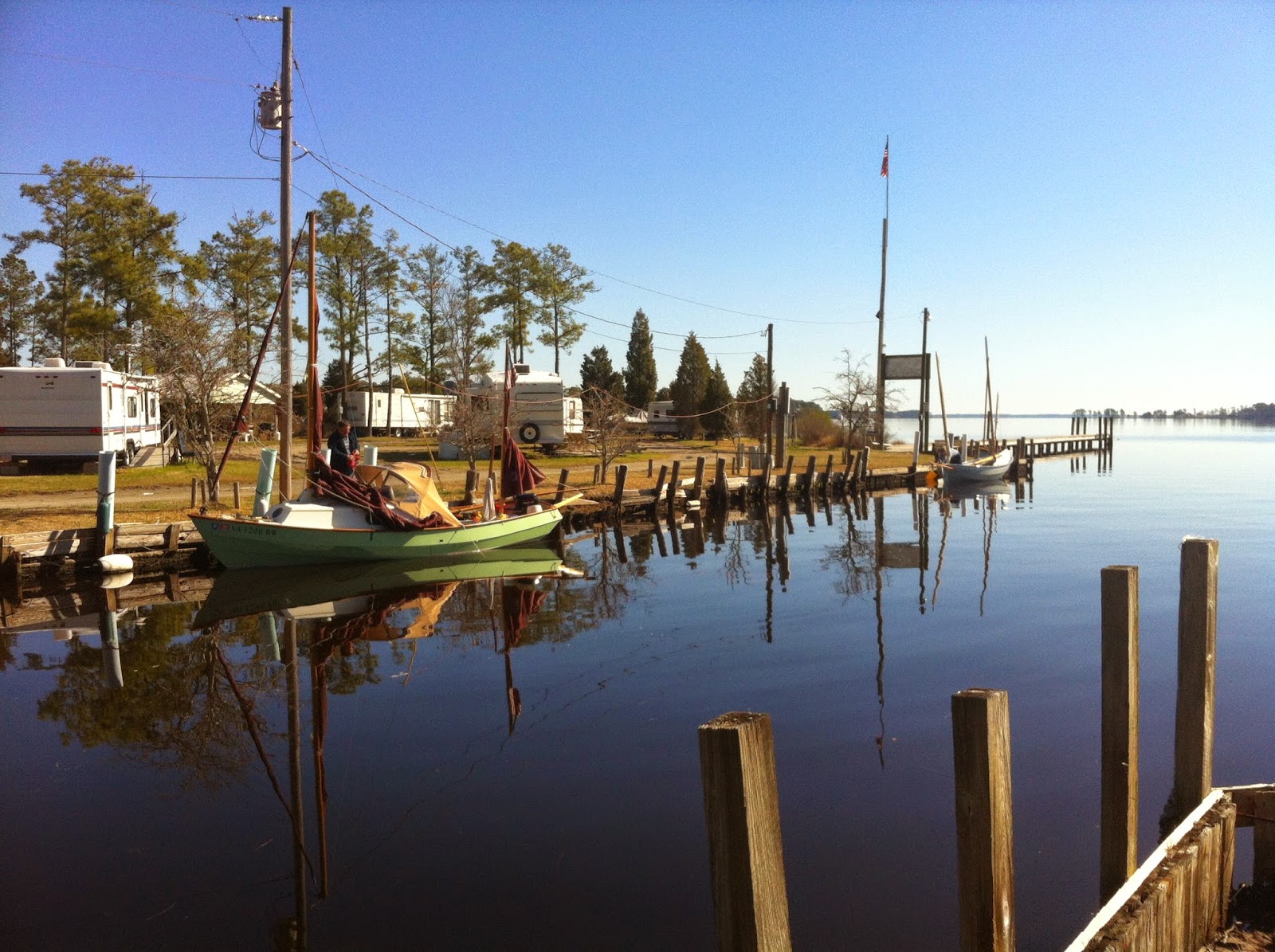 I got invited to take a few days sailing on the edge of the season. Not surprisingly, it offered a mixed bag of conditions from near calm to high Force 5, from cold and rain to warmth and sun. We put in at Belhaven, NC’s fine public boat ramp. Three boats attended: Nip a Caledonia Yawl and Annie a wooden Drascombe Lugger with small cuddy.