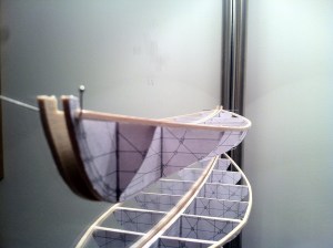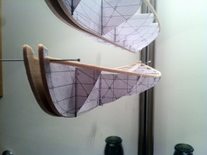 Doing so may make me officially a sucker for double enders. Seeing this one trailing along in the wake of our Rozinante “Luna” is not a stretch. The design may be a descendant from native American canoes. The construction certainly is reminiscent of them. Or, maybe its salty lines were borrowed from old norse faerings ancestors. Like an Inuit kayak, the Ducker’s lines have a strength and beauty derived from practical evolution and the hands of countless builders to present a charm hard to master. Still, there are enough differences in the two plans I possess that I decided to make a study of it. Overlaying the drafts in the computer showed the Greenbriar to be 3″ longer, 2″ thinner in beam, a fuller bow in section, but slacker bilge amidship. The York likely has more initial stability and resistance to heeling, but the Greenbriar should row and slip through the water more easily with her thinner waist. With paper and balsa, I glued quick models using the stations and elevation for further study.
