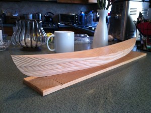 I canvassed the household for their opinions on which boat was favored. It was a tie. No help there. The York appears more elegantly dainty. The Greenbriar seems quietly confident in her beauty, more of a pony than thoroughbred. Is this a decision? Perhaps, but I’ve always admired carved half hull models, have wanted one for my office, and have now begun a 1 1/2″ scale version of the Greenbriar. Its sides will not be clinker, but rounded even though I doubt I’ll build in either carvel or strip.
