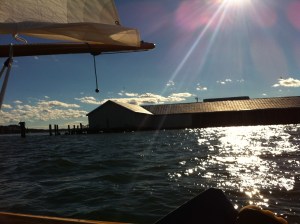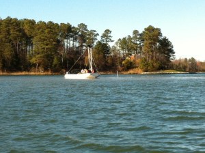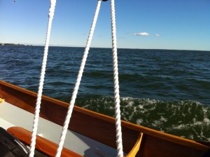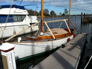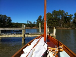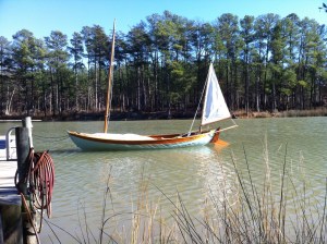 Last October I sailed a boat that I’ve admired for some time, the Delaware Ducker. As a child, my family cruised from Norfolk, VA to St. Michaels, MD nearly every summer. I recall on one visit following my mother across the lawn of the Chesapeake Bay Maritime Museum. It was a grey day and the swollen Miles River edged up into the outbuilding displays. At 11 or 12 years of age, the smaller boats exhibited fascinated me. You could dream of maybe owning one. A drab green punt version of the Ducker must have caught my attention. I’d almost swear to it. This smart skiff exudes adventure easily enticing a little boy’s wanderlust. Likely developed from canoe traditions, this light clinker built skiff is perfectly symmetrical fore and aft. The bow is identical to the stern. Long ago very common to the shores south of Philadelphia, hunters employed the craft to chase rail birds in the marsh. An understated beauty from the 1800’s , it quickly stuck in my mind when we were reacquainted on a solo cruise maybe 3 years ago. To sail one would be fantastic. The boat looked “right”. The chance did present and I was enthralled with the boat’s lively performance while sailing and rowing. It seemed like a Laser in disguise. Soon after I purchased plans of the two versions documented best. As a “vernacular” skiff, there are undoubtedly many other variations, but the now known “Greenbriar” and “York” are well documented. Save for 2-3 originals in museums on the East Coast, the hundreds of others have likely dissolved. We can be grateful a few people sought to preserve these simple lines and now those who wish can build a replica, can. No one has promoted the Ducker more than Ben Fuller at the Penobscot Marine Museum. He wrote several articles on the vessel for WoodenBoat while curator at the Mystic Seaport Museum. Ben in fact owns a Greenbriar in his gaggle of small boats. I’ve read and reread his articles, stared at my photos of the Greenbriar at the in St. Michaels, MD, and lofted both designs in the computer. Frankly, I’ve been haunted by the boat for some time. Sailing one may have put me over the edge. Shoot, that may be as good a reason to build one as any.