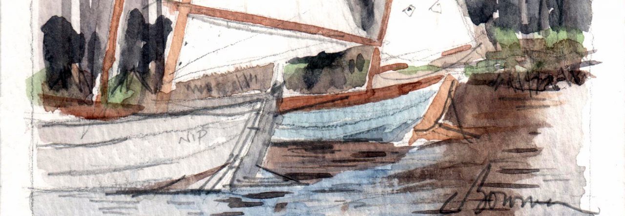 Paul Gartside is perhaps the premier designer of traditional wooden boats. He’d likely take exception to some aspects of the term “traditional”. He does have a varied catalog, but many of his creations could sit gracefully in any English harbor a century or two ago. His book, “Plans And Dreams, Vol. I” arrived for Christmas. Any of the 23 boats featured there can be built from the contents of these pages. Each write up tackles a different aspect of boat building while providing entertaining descriptions of the subject vessel. The approach is delightful and worthy of re-reads. One chapter focuses on design #166, the Centerboard Lugger. I ordered the $15 study plans, stared for several evenings and compiled a partial materials list. The construction method for the hull (cold-molded, strip planked or clinker ply) is up in the air. Not having tried c-m, that method holds interests me. By laminating 3 veneers over a mold, you end up with super strong plywood in the shape of a boat. The technology was a peacetime off-shoot from WWII airplane manufacturing (most notably the English DeHavilland Mosquito bomber).