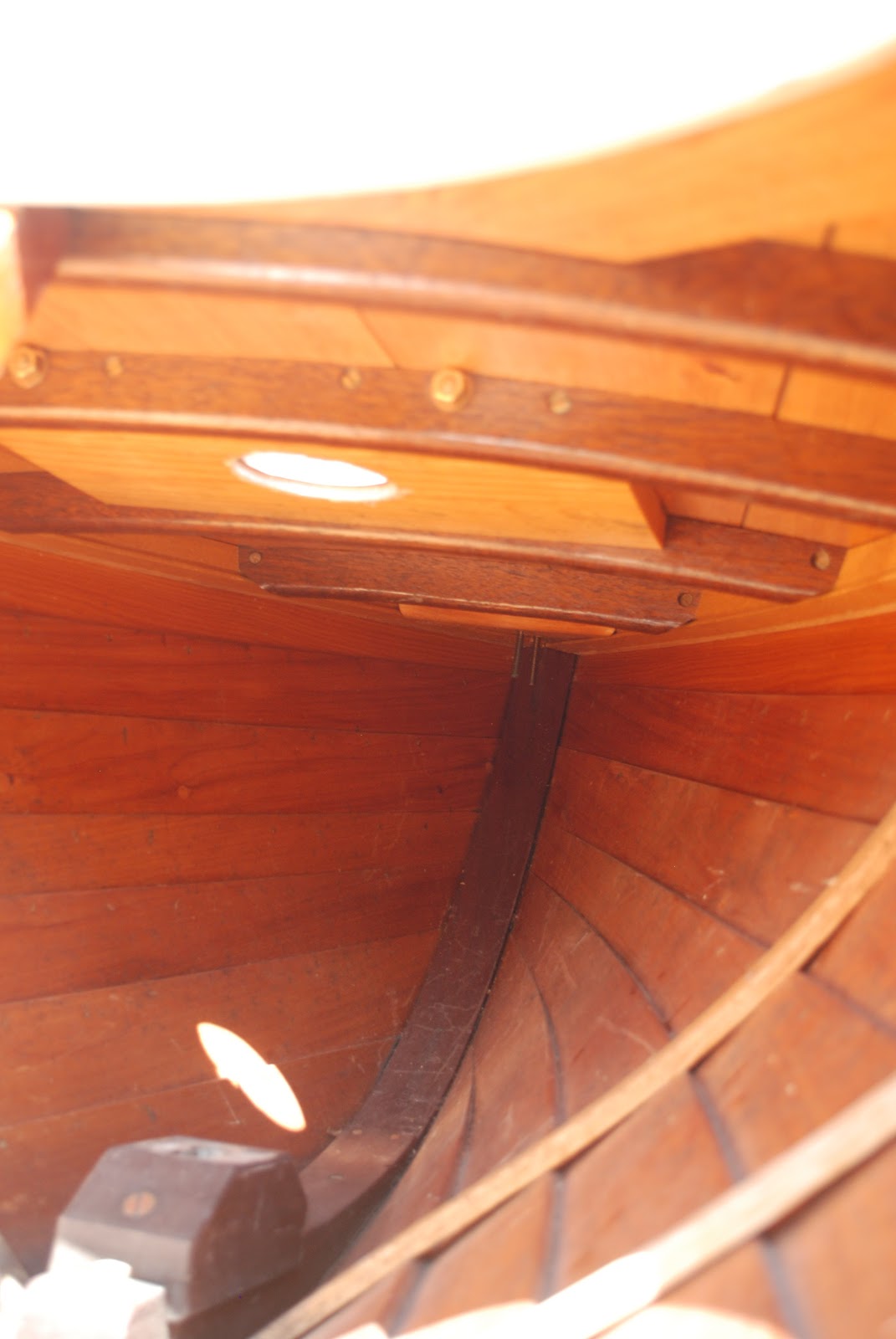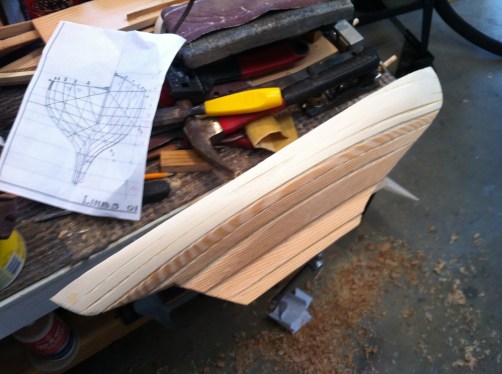 Last week, got the 1/2 hull shellacked.  I decided to add the stems and keel lastly. Stems are cherry. Keel mahogany. Female cardboard station profiles were great for checking for proper lines. Without proper gouges (I’ve since ordered some), the last sneaking up on the lines took some sanding … quite a bit. Anyway, now I’ve a true study model, some inspiration for the real thing and if not, wall art.