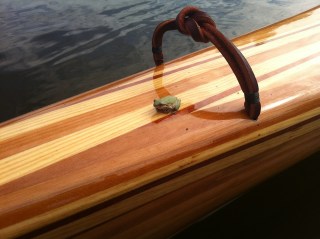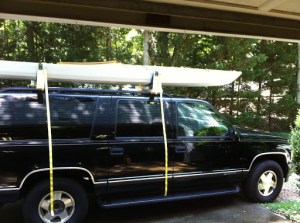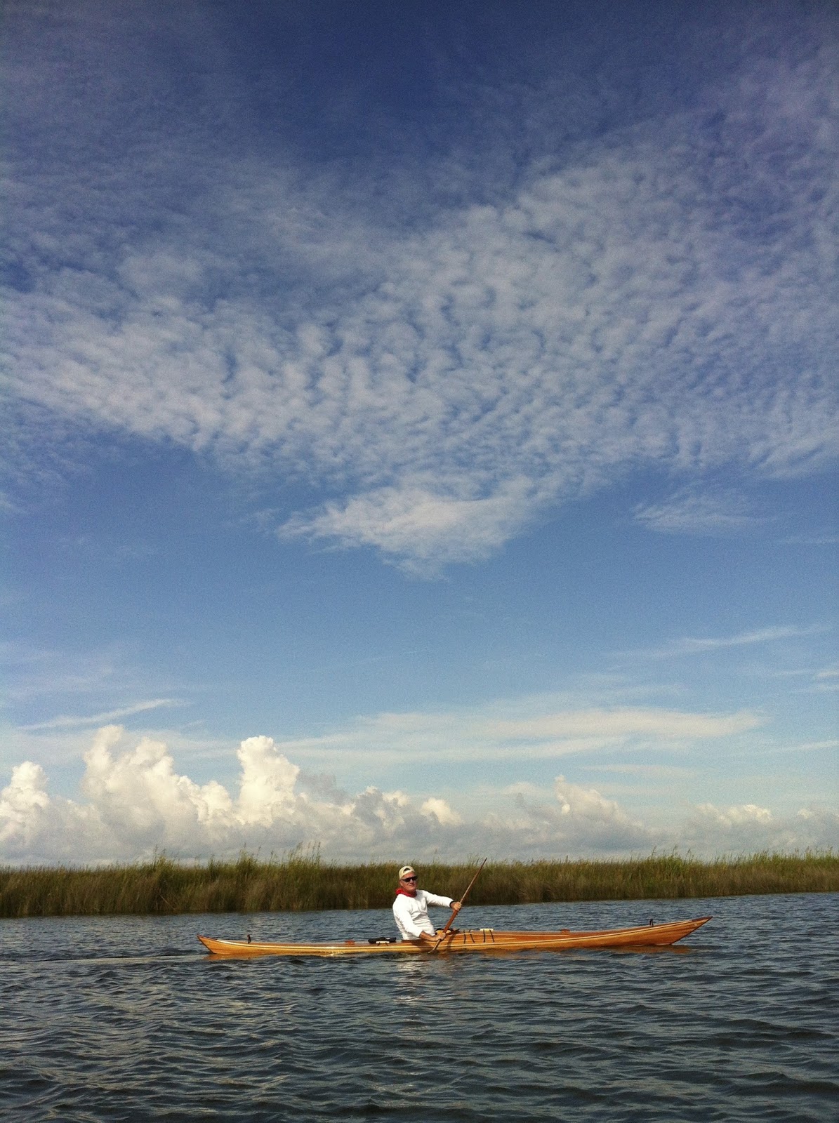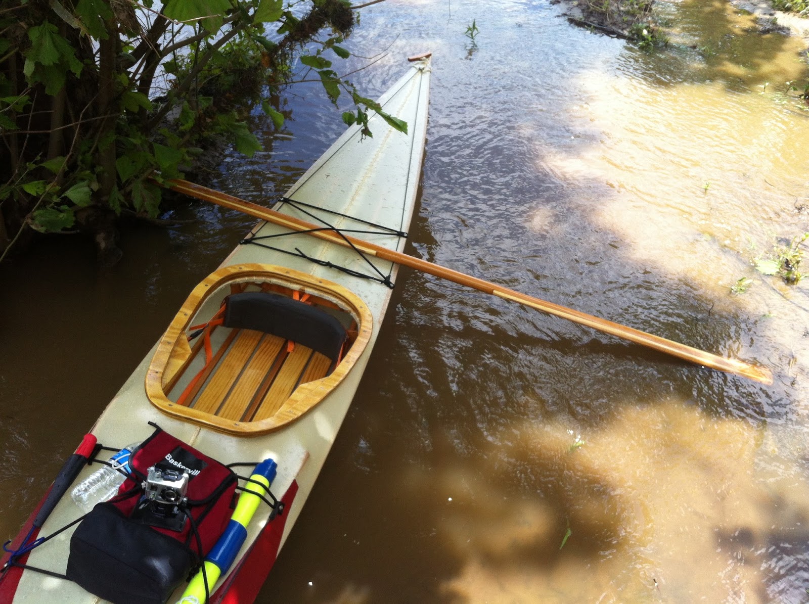 After this past weekend’s trip to St. Michaels, I left the kayaks on the truck’s roof for washing and storage yesterday. That didn’t happen. I thought another paddle might be good. This morning’s breakfast was quick: coffee, boiled egg and toast followed by a long walk for the dog (he’s been acting up. Now he is sleeps at my feet). Our stroll was pleasant with cooler temperatures and early sunshine. That convinced me to drive down to the local park and check out the river. Despite the rains, the conditions were good. My Outer Island kayak at 37 pounds is easily hauled around, especially with the dolly I built. Loading the boat with necessary gear, I wheeled it from the parking lot down to the floating pier.