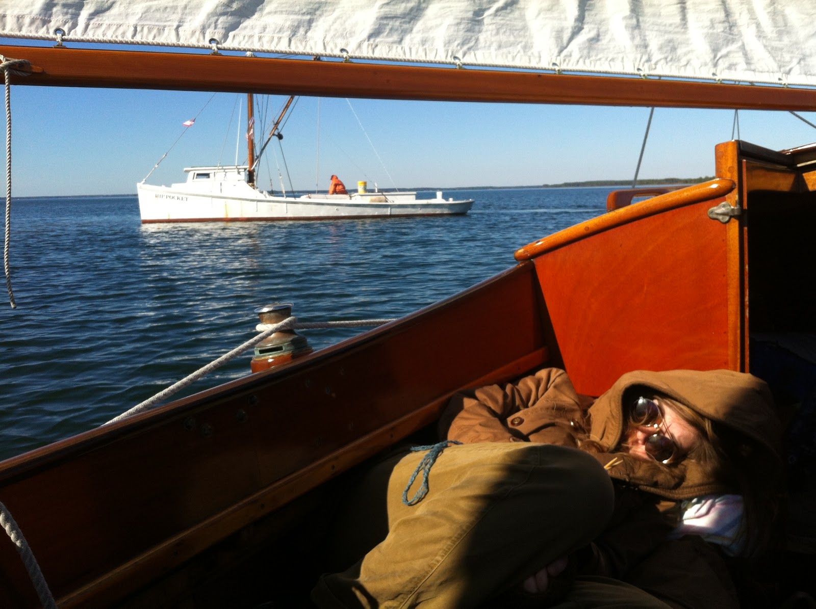 The fresh morning breeze takes us out into the Wicomico and Bay. Setting a course for Tangier Island, we head dead downwind. I devise a whisker pole using the boat hook to sail jib and main wing and wing. Luna practically sails herself for hours until we seem to be headed for the same point and time where both a tug and cargo ship are headed. We first bear off close behind the tug whose following barge make a slick of the sea. The huge prop wash pushes us around. We then have to head up and cross behind the container ship as it’s wake lifts and lowers us like an ocean swell.
