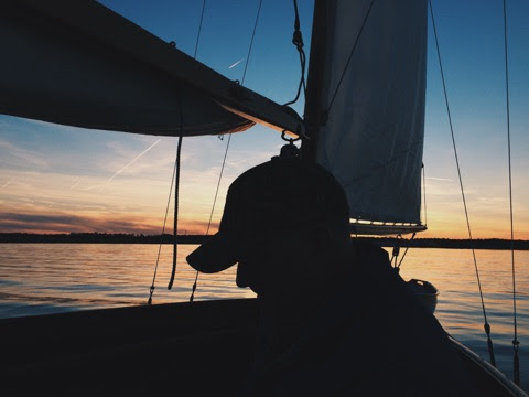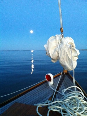 After adding a couple of bronze eye straps for securing the boat cover, I hanked on the new jib and went out into the river to anchor briefly and scrub the bottom. The slime wasn’t bad, but you could tell it was there. Luna just wasn’t as fast. And she is. A few barnacles were on the base of her keel. I probably forgot to hit that portion which rested on blocking at haul out. Getting back into the boat turned out to be a bear. The webbed loop ladder used for UNA twists too much. Those chin up routines from age 13 are wearing out. I’ve some ideas on a better homemade solution. After raising anchor, we had a delightful beat out into Mobjack under full sail. Luna collected a few compliments from other boaters as the two of us slid along. Once out we did an about face and reached back up the river a good ways before returning downstream. The evening was near perfect. I decided to stay. The hook was dropped and cocktails offered as the sun set with music playing low. Too lazy to fix dinner, I opted for cake. A great diet. Recommended.