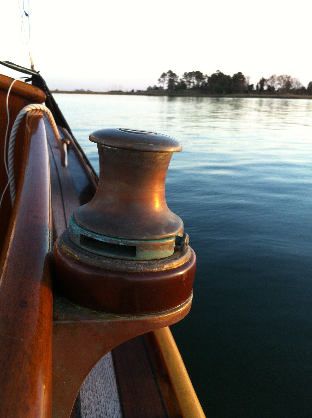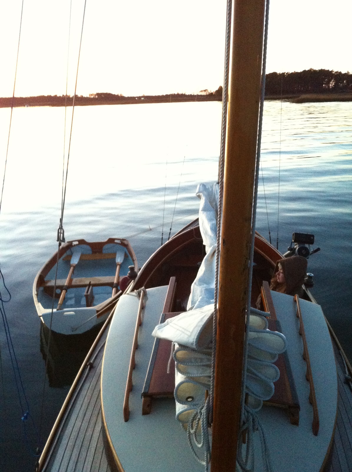The late Fall sun was low and brilliant, coloring the marsh grasses and evergreen pines. Once in Browns Bay, distracted by the view, we nudged Luna onto a mud bank as the ebb tide was 30 minutes from low. Two sailors on the bow and a winding outboard weren’t sufficient to push the long keel towards deeper water. Pulling out the 16# claw, I rowed out 75 yards to set the anchor.