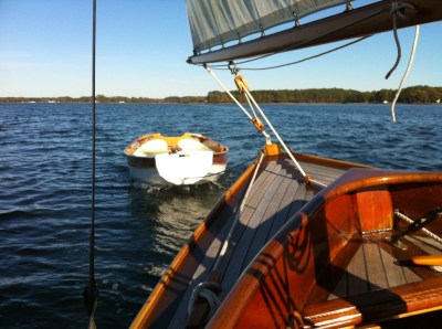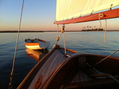 What was to be an enjoyable week of sailing north simply went bust. The journey was to include St. Michaels, MD’s Mid Atlantic Small Craft Festival. Last week, this week was a perfect forecast. However, by Sunday this week, the realization that the weathermen may have been mistaken was settling in. The new week’s predictions of 3-4 days of rain and thunderstorms botched our cruise plans. Mildly put, I was bummed. Short term forecasts are often wrong. These opinions of “experts”, if accepted, could have prevented many wonderful days on the water. And so, with characteristic denial, I grabbed my pup Huckleberry, a week’s load of goods and drove to Mobjack. After an hour and a half prep, LUNA was ready to depart. We set off for our adventure. Sunday’s sail was fantastic: a downriver run into Mobjack, a close reach across the Bay, a port beat just north of Cape Charles and finally a starboard tack to Gwynn Island for the night. As the sun was dipping, we chose to motor through the Hole in the Wall. This is a meandering entry through barrier sand spits which can be tricky. We clear it. Once in Milford Haven, we anchor behind Point Breeze. Huck was rowed ashore for dog business. Not one to wait, he jumps ship twice en route. The second time I make him swim the final 100 yards to a small piece of beach. He didn’t seem to mind. The pup takes 20 minutes to run his willies out. We then returned to LUNA for a light cockpit served dinner under lantern and sky. The air was dry and cool. I sleep below. The pooch under stars. A slight notion occurred that he may be AWOL come morning, but he’s still aboard next morning. We take an early dinghy ride. This time I keep him on a short leash. Yet, he still has enough slack to hang himself and does as he leaps over anyway. Our four legged tug begins towing the dinghy to the beach. Accepting his spirit, but questioning his stamina, I land the little tuna. He is an exceptional nut ashore, biting small waves, pulling at reed grass and racing all over the marsh. After 30 minutes he regains his sanity. We row home, eat a breakfast of coffee and biscuits, and listen with hope to the forecast. Predictions are worse. Tuesday through Thursday are now rainy with northerly winds. Not good for heading north quickly, especially when mixed with a wet dog. So, we weigh anchor, motor back through the Hole and beat against the day’s southerlies back home. The sailing is very fine despite our “retreat”. And so, we make the best of both days. They were “perfect”. Here’s 3 minutes to show their flavor: