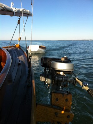 I start the engine readily, throttle up and walk forward to help the bow shake loose. However, because I forgot to add the motor bracket’s strut, the engine breaks free and douse itself just as I grab the motor. Only the tether keeps me from losing the new engine. After setting the engine in the cockpit, Big T motors past. We try twice to yank Luna free. No luck. T’s 4 hp engine has enough to do keeping her in the wind. A 50′ motor catamaran passes by and all crew give us a wave. Keeping my fingers clutched I just shake my head. Now, I’m ready to haul the main up and sail off just when a kind waterman in his skiff “Miss Stuart” offers a tow which we accept. He takes us back to the piling we missed earlier and ties us to it. I reinstall the engine (with bracing bracket) and slowly try to turn it. It’s frozen. At this point I’m expecting the worse, but decide to drain the carburetor after which the engine seems to rotate. A harder pull and it fires up. Distrustful of it continuing to run, I allow it to for several minutes before casting off. The problem now is that we are again aground on the other side of the channel and can’t release the line from the piling. Had I been alone, I would have had to get wet or leave the dock line. Fortunately Kevin can sneak his boat in and untie us. So, once again we’re off and search for a crab sandwich. After a few futile attempts to dock, I suggest we head on to Crisfield or some place east. Agreed, we motor back toward the Sound.