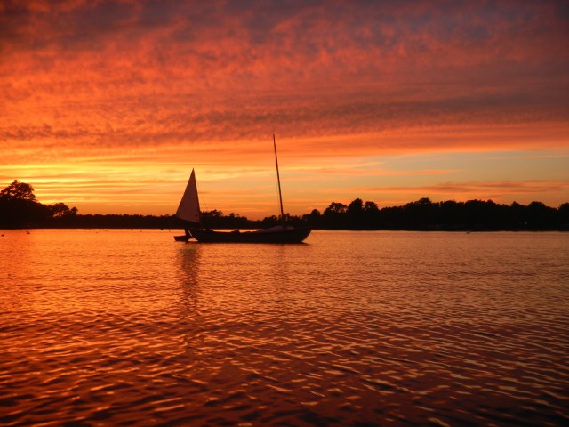 By now it is around noon. With a good beat to Mystic, we buck the current, sneak to weather of White Rocks (not sure if the cormorants didn’t paint them), tack under Enders Island, round Mason Pt. and reach into Mystic’s outer harbor. It is one beautiful classic boat after another. We are a couple of days out from the WoodenBoat Show, but I believe most of the boats on view are permanent residents. We pass through the 2 draw bridges to anchor off Mystic Seaport Museum. Dinner is perfectly battered fish-n-chips at Latitude 41. We have a nice sunset view from the patio under the shade of a large tree. The evening is cool. I sleep until 07:00 when I hear an “oh sh*t!” as a single manned rowing shell discovers at the last moment they are aimed at UNA. Thankfully it is a miss. We take the water taxi Little T to a bagel shop for breakfast and then sail/motor back to the ramp at Barn Island near Stonington. Mike heads home and I pull UNA and do the same. Kevin stays for another night. Together we covered about 100 miles in the 3-4 days.