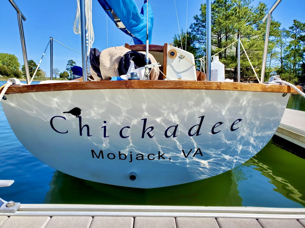 Our Tartan 27 has already proven to be a capable little vessel. The small sturdy bird commonly referred to as a “Chickadee” seemed an appropriate name for our tiny ship. Additionally, my momma used to call her 4 babies “chickadees”. So, yesterday we made it official.