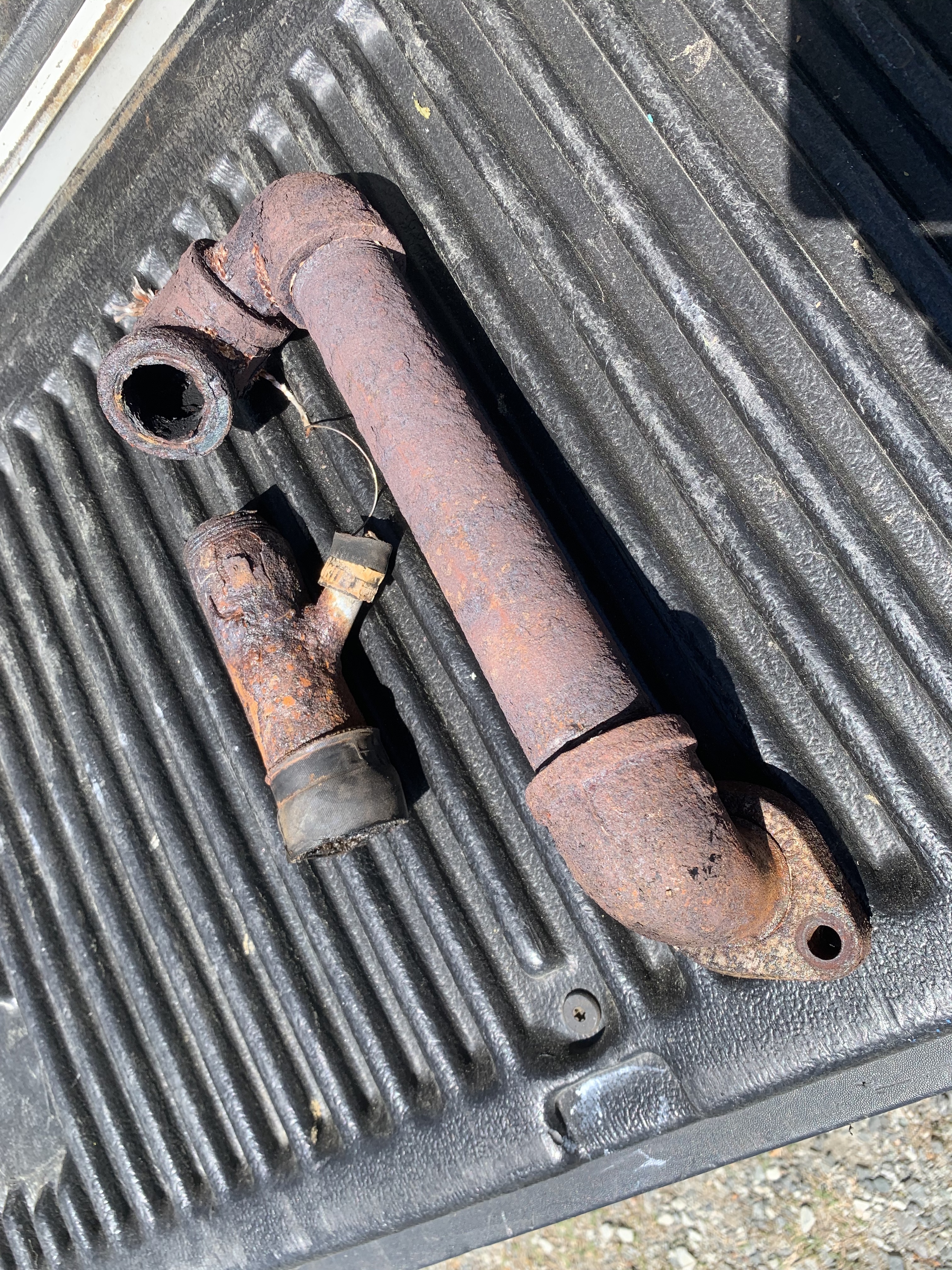 Generally, Chickadee’s old Atomic 4 engine has been running great. It is one of some 40,000 built for marine use over the many decades and half are still pushing boats! Good Old boat has a write up here. The Atomic 4 is a well proven concept of four smooth running cylinders on gasoline versus in this case what would be two banging diesel sleeves rattling your teeth out. At half throttle, Chickadee reaches hull speed easily. Still, long ago, back when it was warm, there seemed to be an occasional problem with the transmission (technically called a reversing gear). The prop, on occasion when asked to push forward, wouldn’t spin or did so weakly. Fortunately the solution wasn’t difficult, or so it seemed. The cockpit shifter’s linkage wasn’t throwing the “reversing gear’s” lever arm far enough to engage fully the prop shaft and engine. As luck would have it, while adjusting this travel range I elbowed the water lift exhaust hose. Chaos ensued. Water began spraying everywhere. The original iron pipe exhaust had crumbled and given way. Thankfully we were at the pier and not out cruising. After shutting the engine down and closing the thru-hull a harder look at the exhaust revealed all common black iron pipe and fittings. They weren’t at the big box stores, but Ferguson’s had the pieces to assemble a new exhaust.