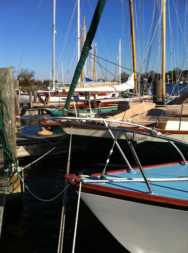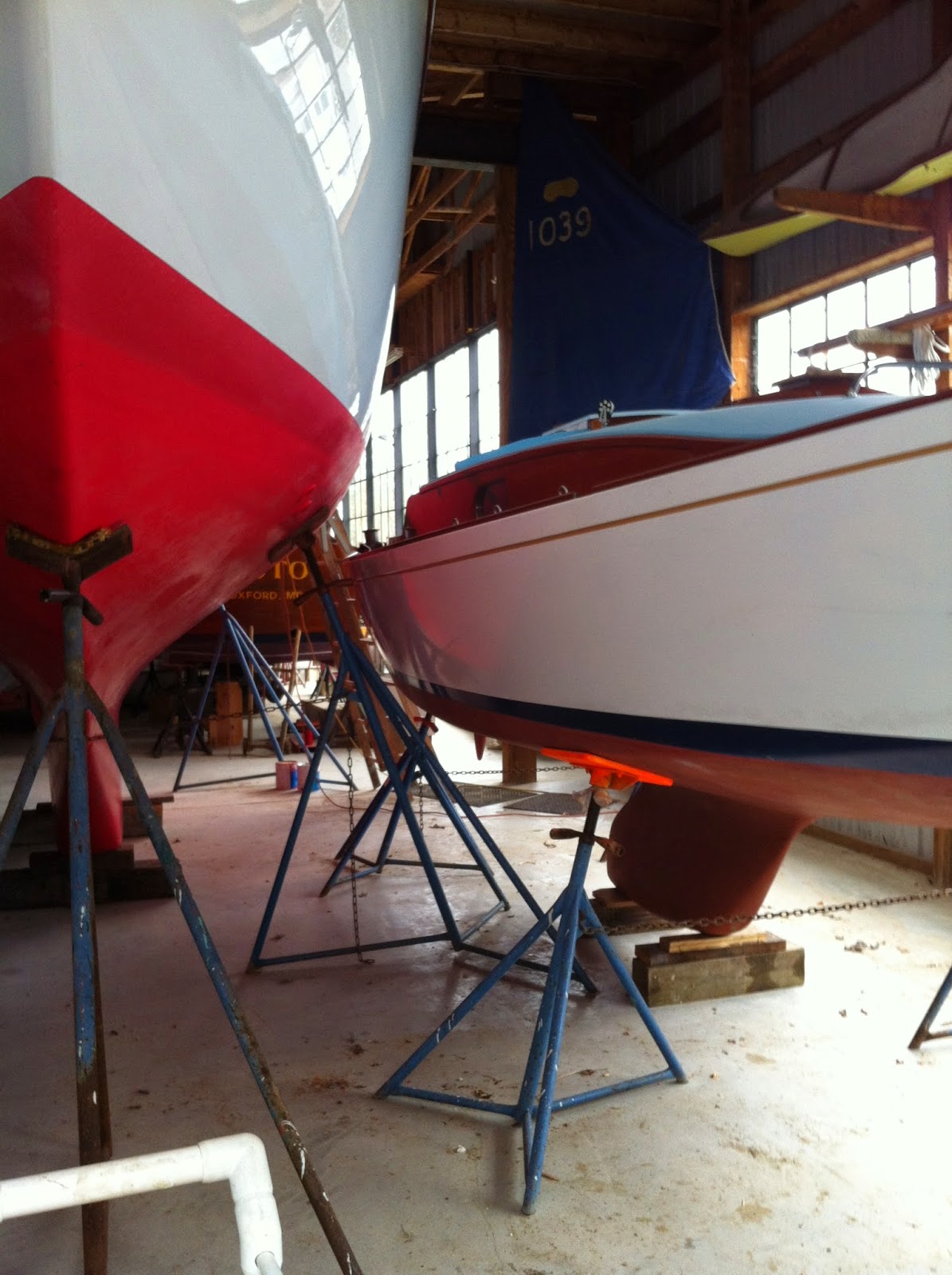 Outside the breakwater entrance, winds were a steady 20-24 mph with gusts near 30. The sail was lively.  Anxioous to see how Big T sailed, I hogged the tiller all the way into the Tred Avon where Tidings tried to overtake us under full motor, but alas Big T turned her head and rolled on ahead and turned the corner past Oxford’s Strand to visit Cutts and Case Boatyard up the creek there. One of the Cutts brothers, Ronnie, loaned us his truck to shop for track slides that had blown out earlier in the day. We took our time studying the many beautiful old wooden boats there.
