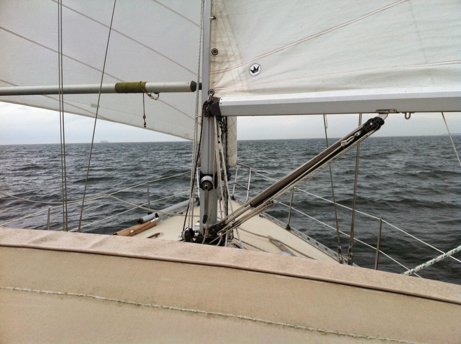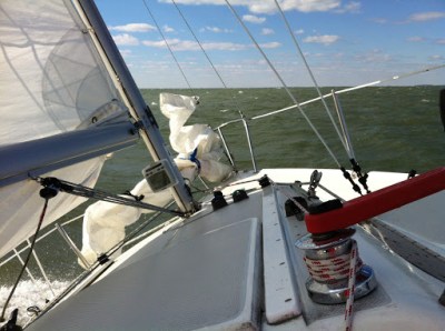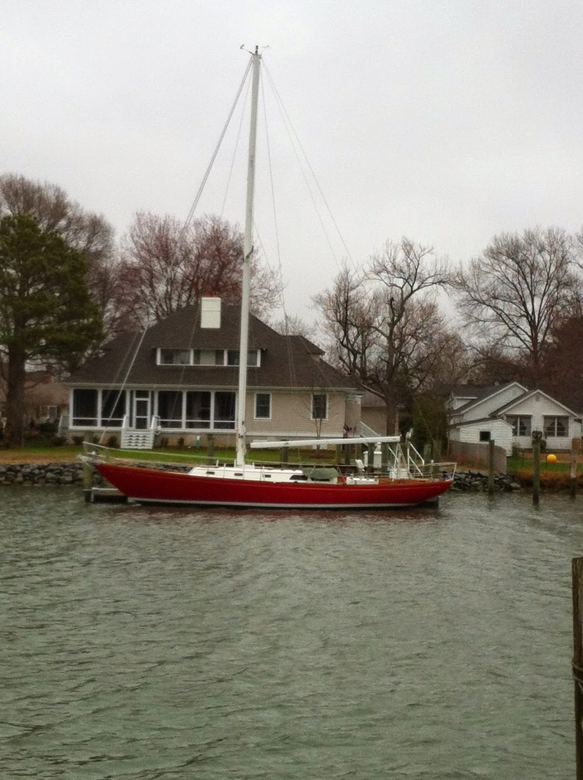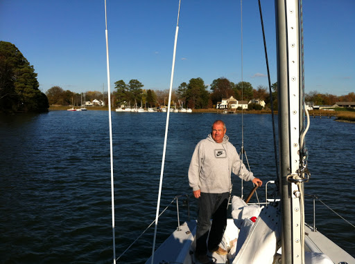 Over canvassed with the only reef in the main and a small jib we bashed into the Choptank. Soon we dropped the jib to carry on. With those 30 mph blows, we still had too much sail.