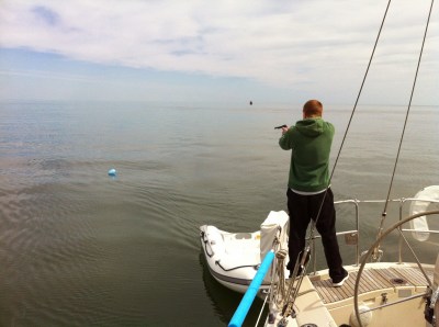Pancakes were made under way. Motor sail past fishermen repairing their traps in Fleets Bay, before turning south. The wind fails us so we pause to shoot balloons past Wolf Trap Light.