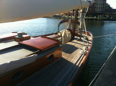 Before my classic Luna, I was mightily tempted by the lovely Time. I found she was again for sale in WoodenBoat for sale. After an earlier visit to Oxford before launching, I called Mark and arranged to help rig her in exchange for a sail. The day was sunny, but winds were less than 5 mph and I confess I was skeptical Time would move along, but move she did. With hardly a breath she pushed under full sail effortlessly and her 8,000 pounds gave momentum to her way. Thought I’d share 2 videos of our sail.